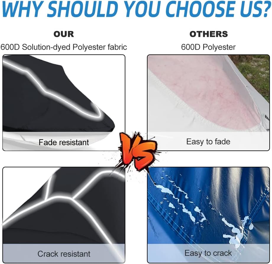 FADE AND CRACK RESISTANT FABRIC: We use extremely durable marine-grade 600D Solution-dyed Polyester fabric. Thicker material and double-stitched design ensure our boat covers can work for a long time. Compared with other similar products, in addition to basic waterproofing and UV protection.The most important thing is that it will not fade and crack in the case of long-term high temperature and rain soaking. Maximum protection of your boat from sun, rain, dirt, contaminants, and more.