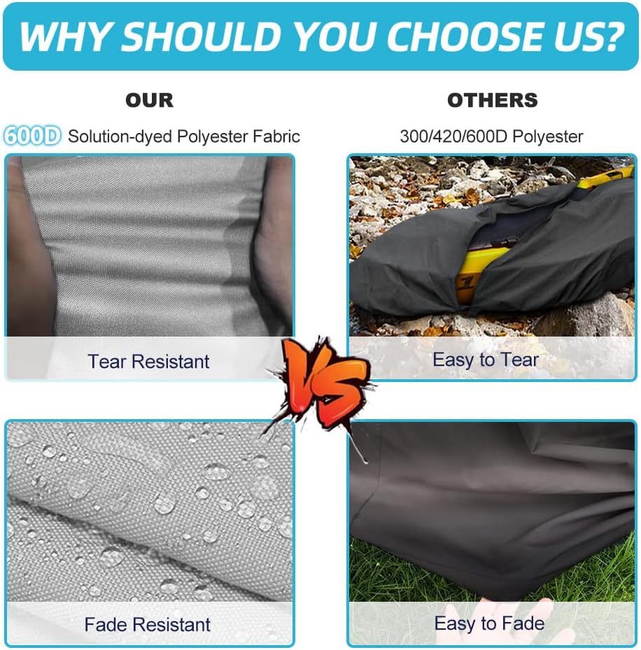 100% WATERPROOF DESIGN: This kayak cover features double stitching and waterproof strip at the seams, and a special waterproof zipper is used at the zipper to achieve 100% waterproof in all aspects. You can store your kayak outdoors wherever you want without worrying about water getting in through the cover seams or zippers.
