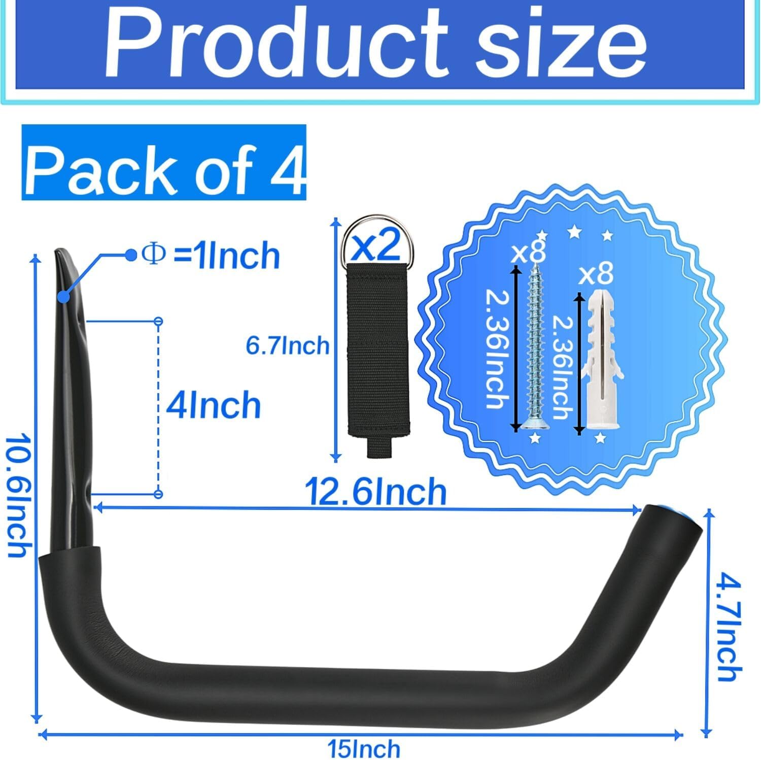 Packaging and Size: 4 pack garage storage hooks with 8pcs screws and 8pcs anchors, hook size: 15 x 10.6in (L x H), 2pcs extension cord storage straps.