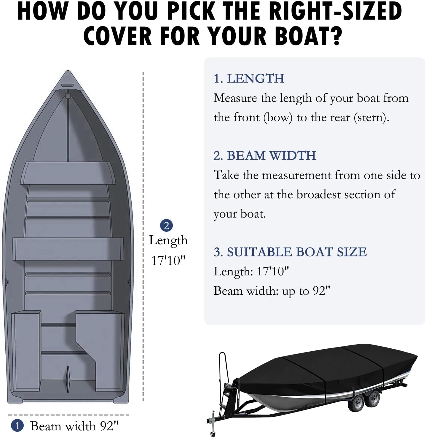 【Universal Boat Cover】Universal Fit for Jon boat up to 17ft 10inch long and beam width up to 92 inch. Please refer to the ship’s dimensional measurement chart to confirm if it fits your boat