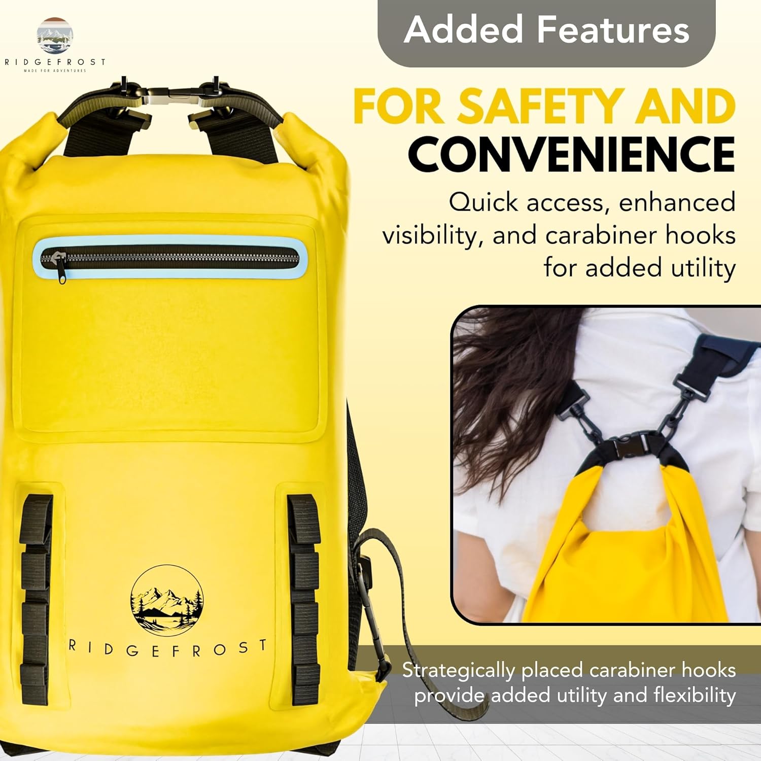 Low-Light Enhanced Visibility Backpack: Safety is paramount, and our waterproof dry bag comes in a vibrant yellow color with reflective trim to enhance visibility, making it the best waterproof backpack for travel, especially during low-light conditions. Carabiner hooks provide added utility, making this dry bag for kayaking an essential piece of your kayak accessories or beach bag waterproof collection.