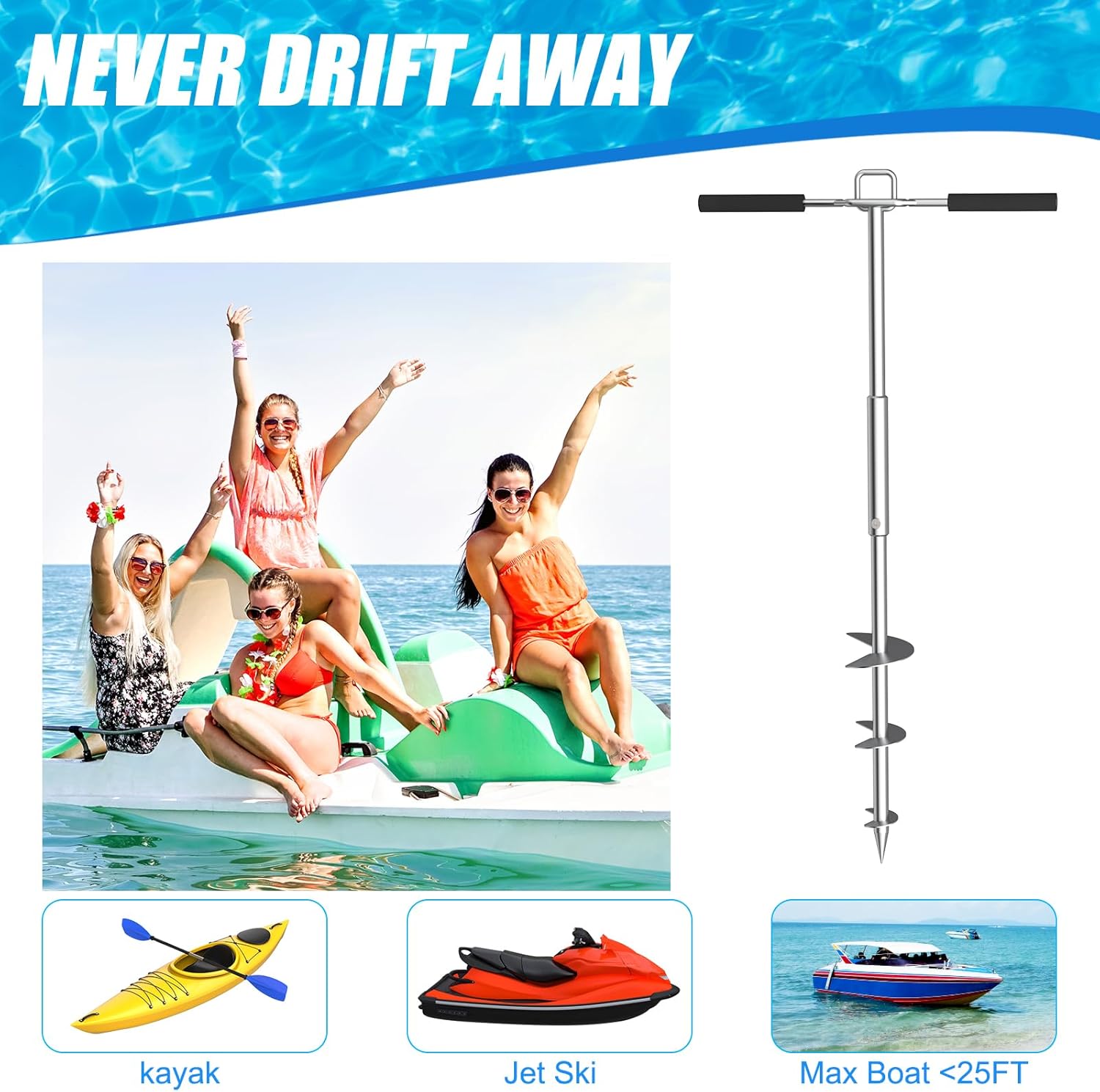 Never Drift Away: The Boat sand anchor is plently long enough at 34 inches with 316 stainless steel Triple auger can go deep into shallow water, beach or sandbars to create strong grip. Keeps your kayak, Pontoon Pwc or other watercraft securely anchored effortlessly when you relax on the beach, never drift away.