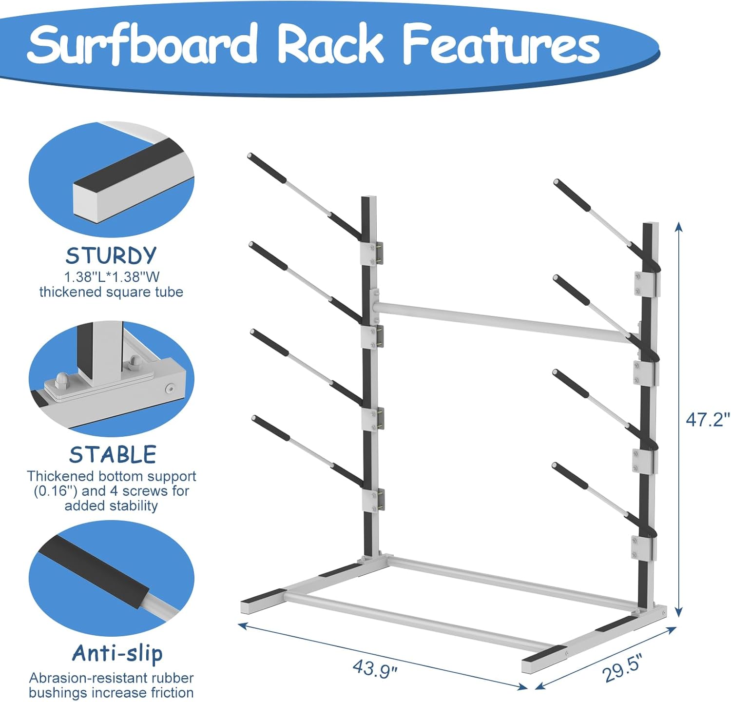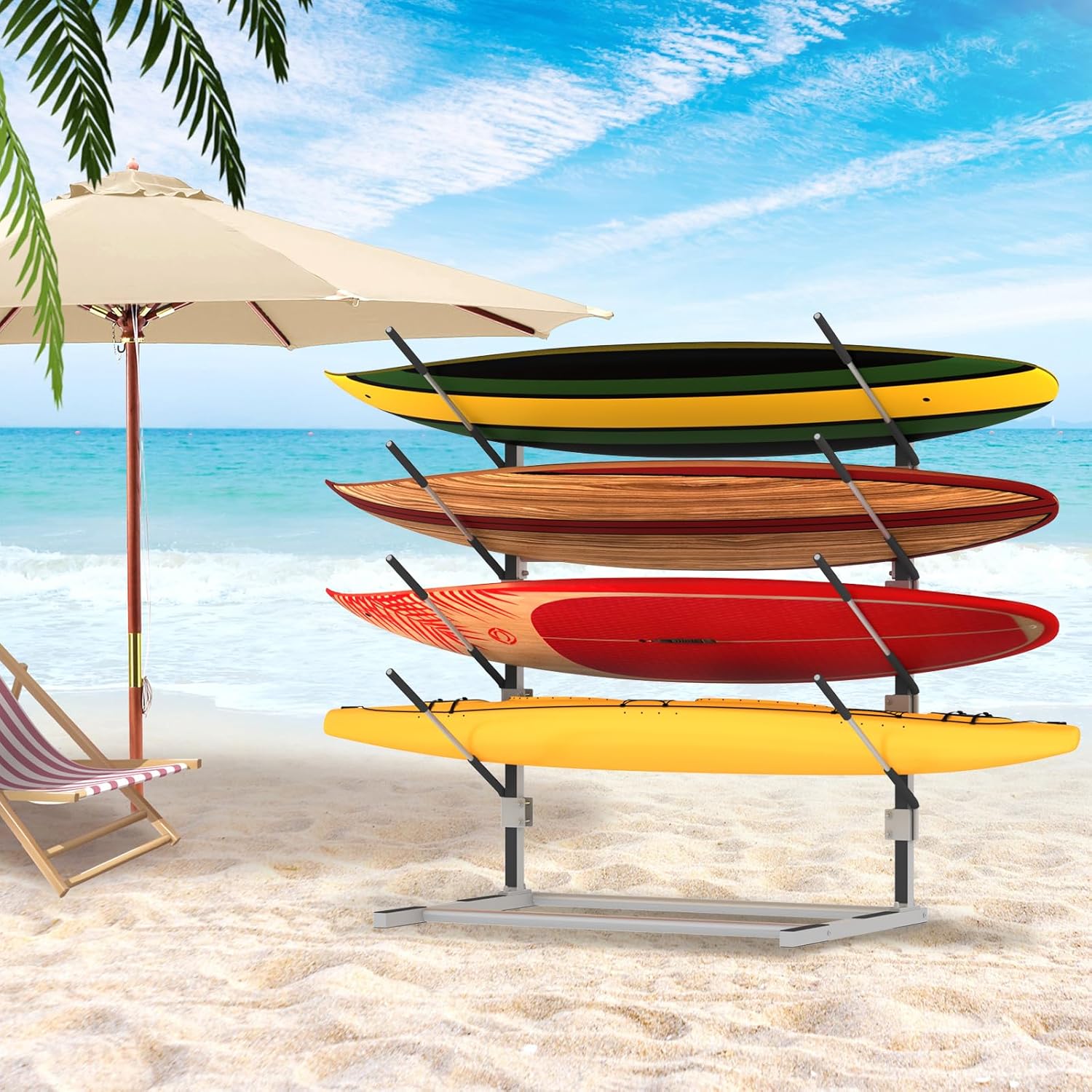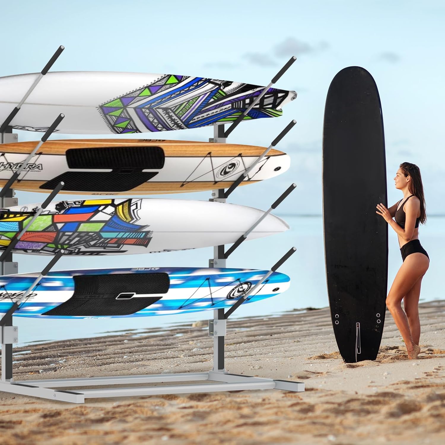 4-Tier Freestanding Surfboard Rack, Watersport Kayak and SUP Rack with Two Silicone Mat, Kayak Storage Rack for SUP, Surfboard, Paddle, Ski, Skateboards