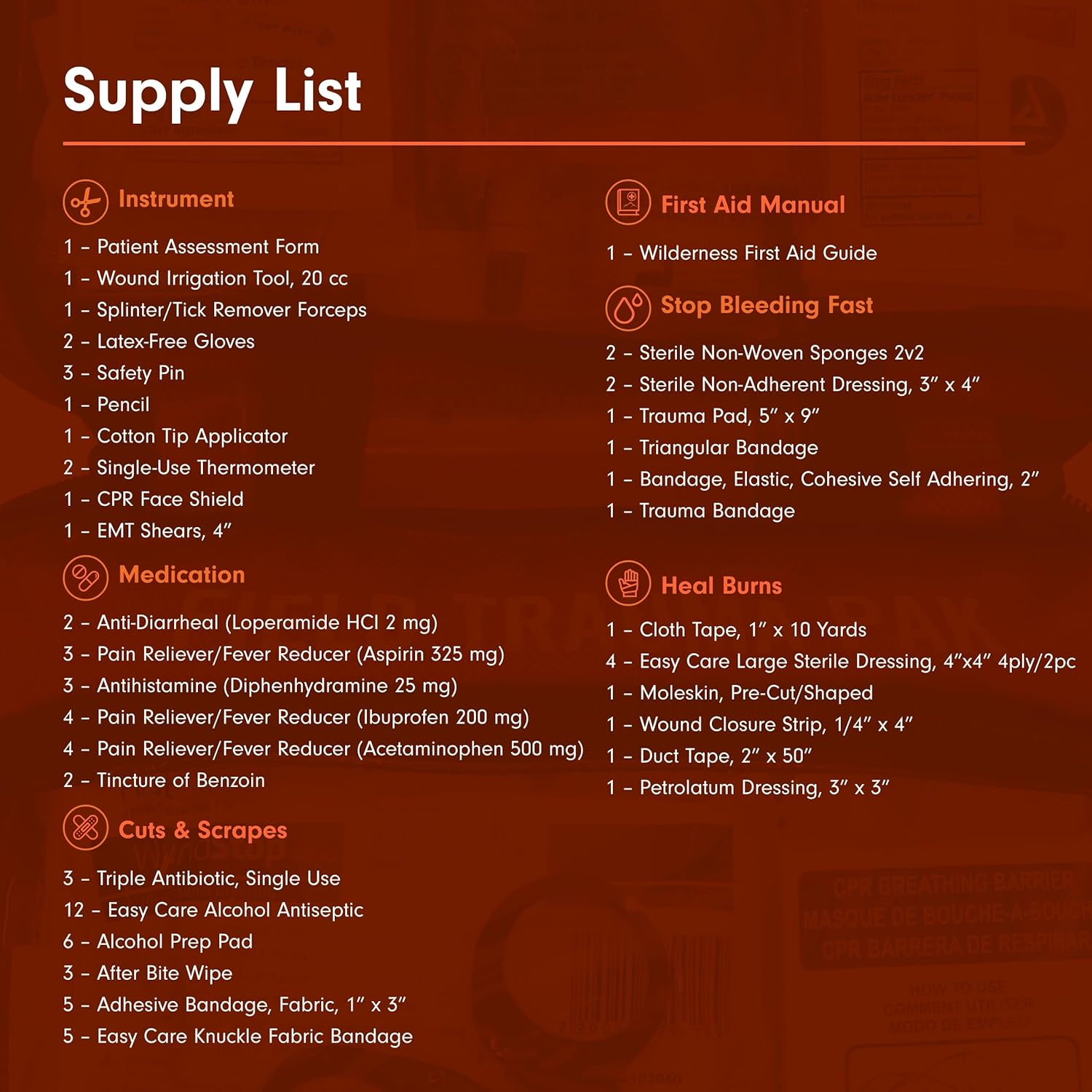 Has a smaller, lightweight, waterproof trauma pack you can bring to stop severe bleeding and administer CPR.