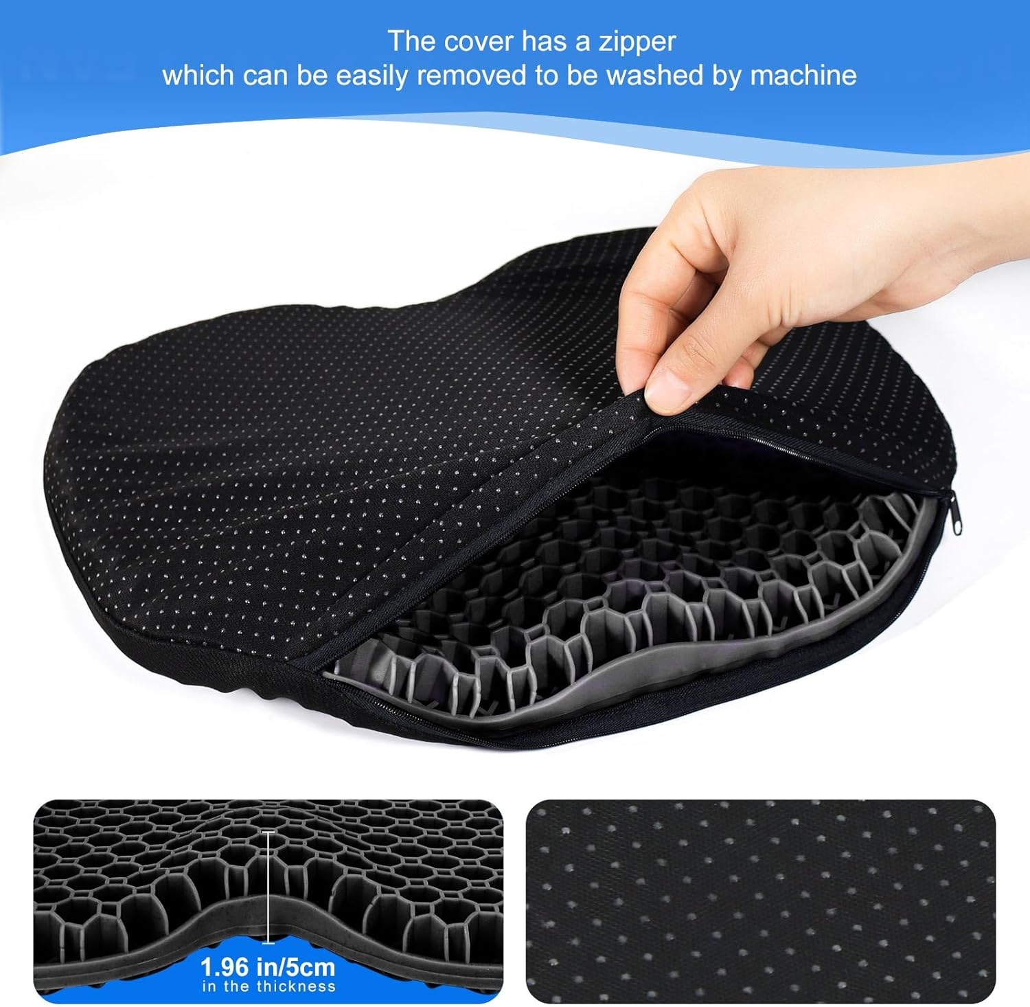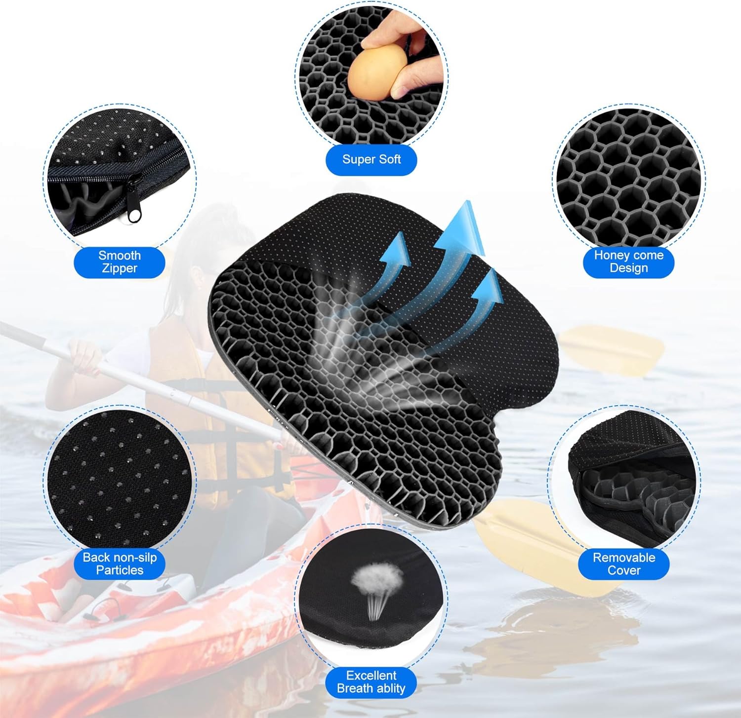 【Breathable and Cool】The gel kayak seat pad incorporates a therapeutic thick honeycomb gel design, enhancing air flow for ultimate cooling comfort and preventing seat sweat. Its double-sided structure improves breathability, making it ideal for bearing loads and enhancing overall comfort.
