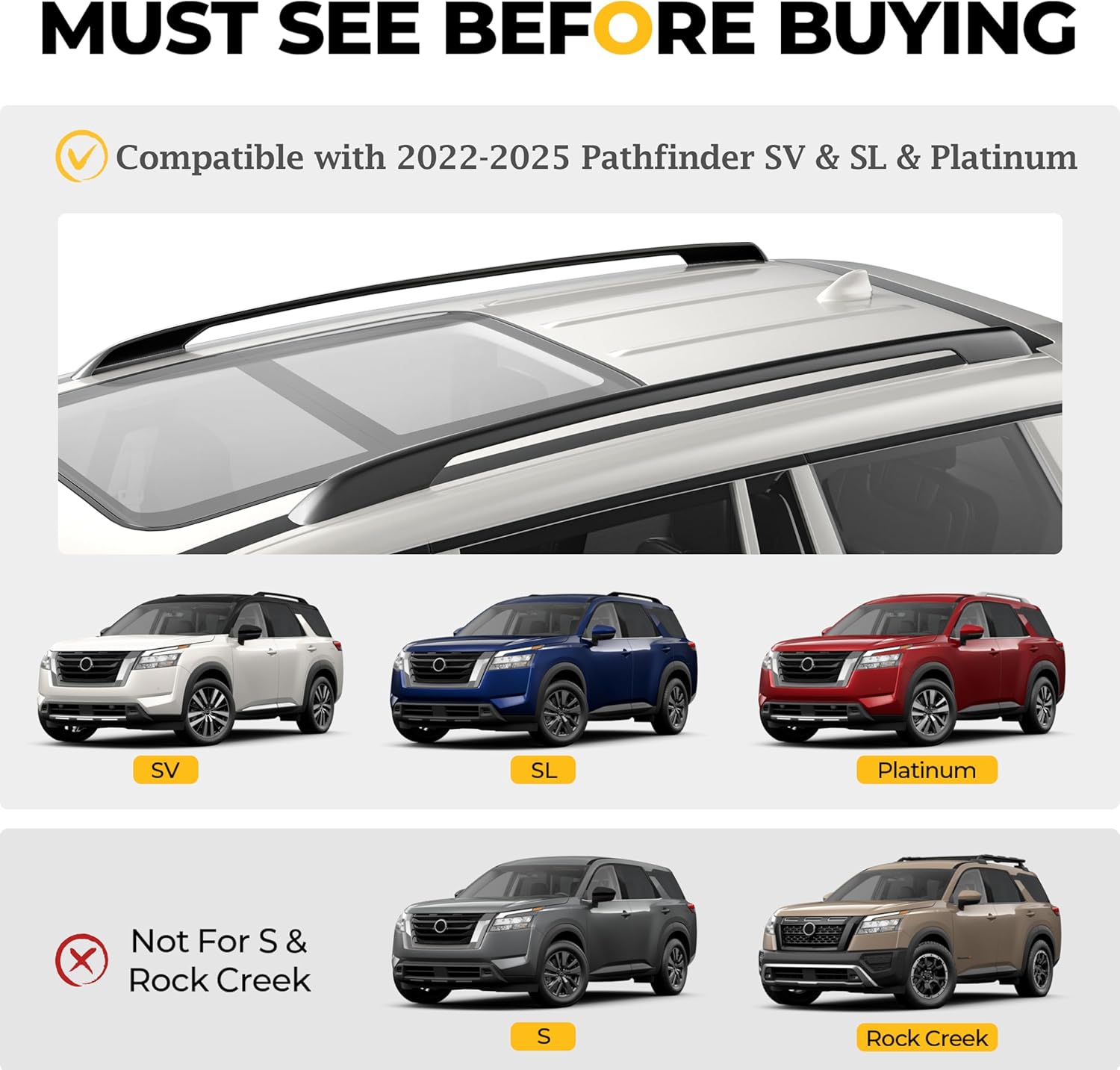 Compatibility: Compatible with Nissan Pathfinder 2022 2023 2024 2025 with factory roof side rails, including SV, SL, and Platinum trims. NOTE: Not for S and Rock Creek