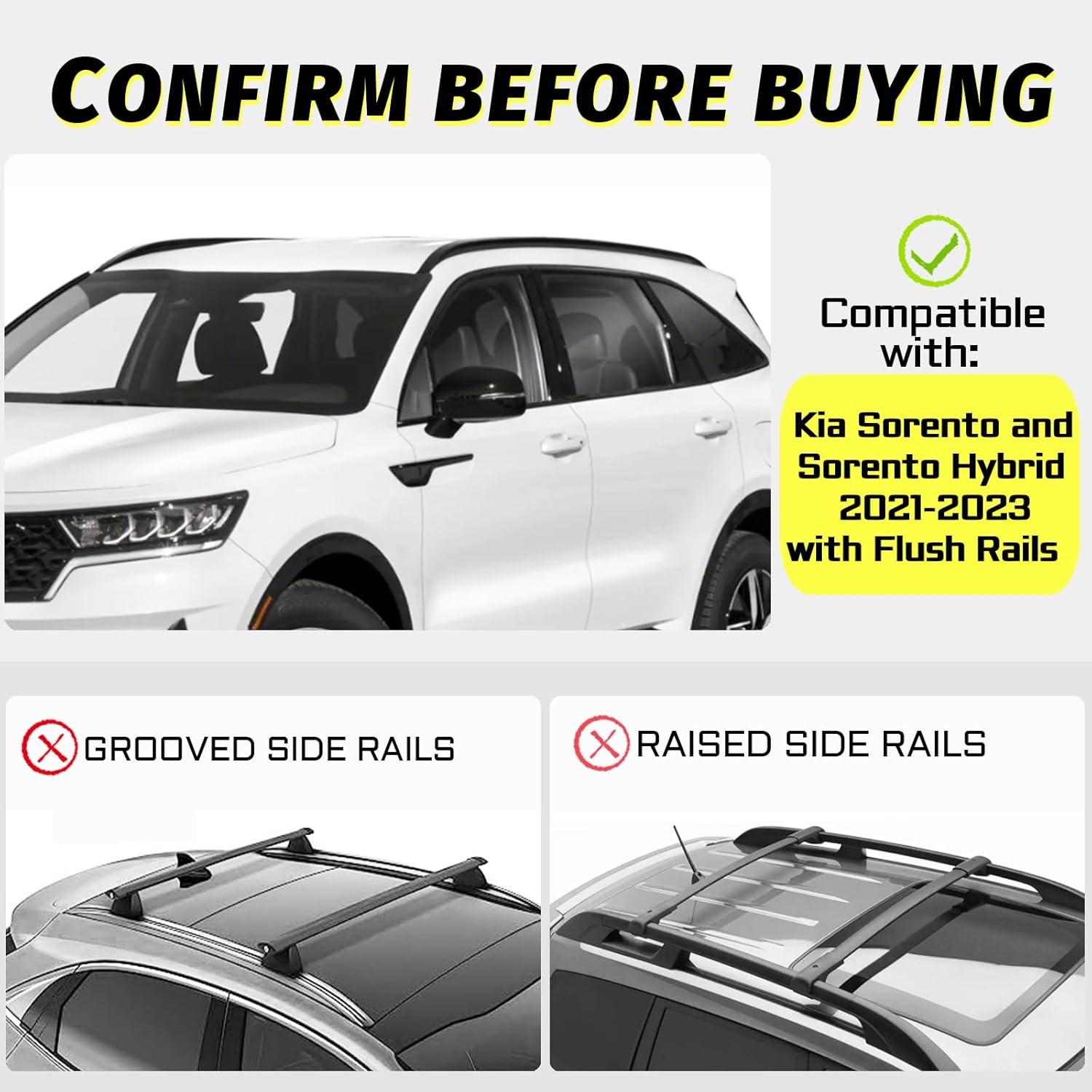 Compatible Vehicle: Roof cross bars compatible with 2021 2022 2023 KIA Sorento LX, S, EX, SX, SX Prestige (with flush side rails) / 2021 2022 2023 Kia Sorento Hybrid S, Hybrid EX, Plug-in Hybrid SX, Plug-in Hybrid SX Prestige (with flush side rails). Not for X-Line trim. Specialized for vehicles, better than universal roof bars. Check the year, make and model of your vehicle before purchasing