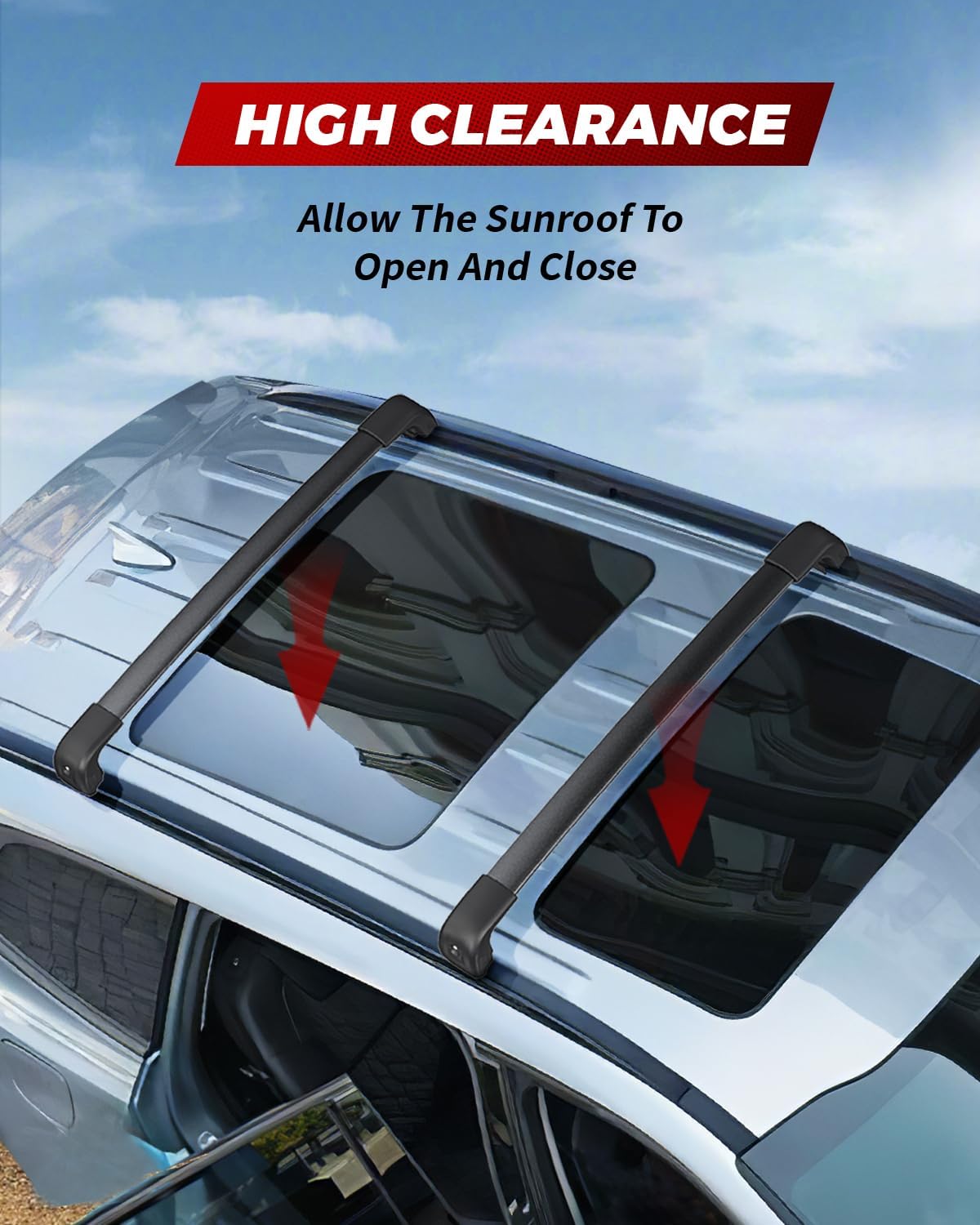 Security and Low Noise: Soruci roof rack beam is made of high-grade aluminum,upgraded to secure locking,and the base foot is made of high-quality plastic. Aluminum is on average 30% lighter than steel and has a greater load carrying capacity than an all-steel roof rack. The low profile and streamlined design make it effective in reducing wind noise at high speeds