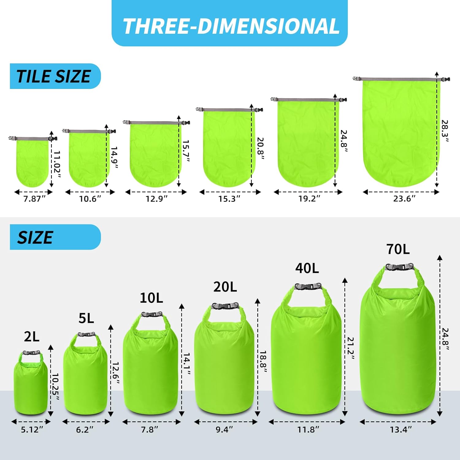 Dry Bag Set, Waterproof Small Lightweight Dry Bags for Paddle Board Kayaking, Fishing, Camping (Green, 70L 2Pack)