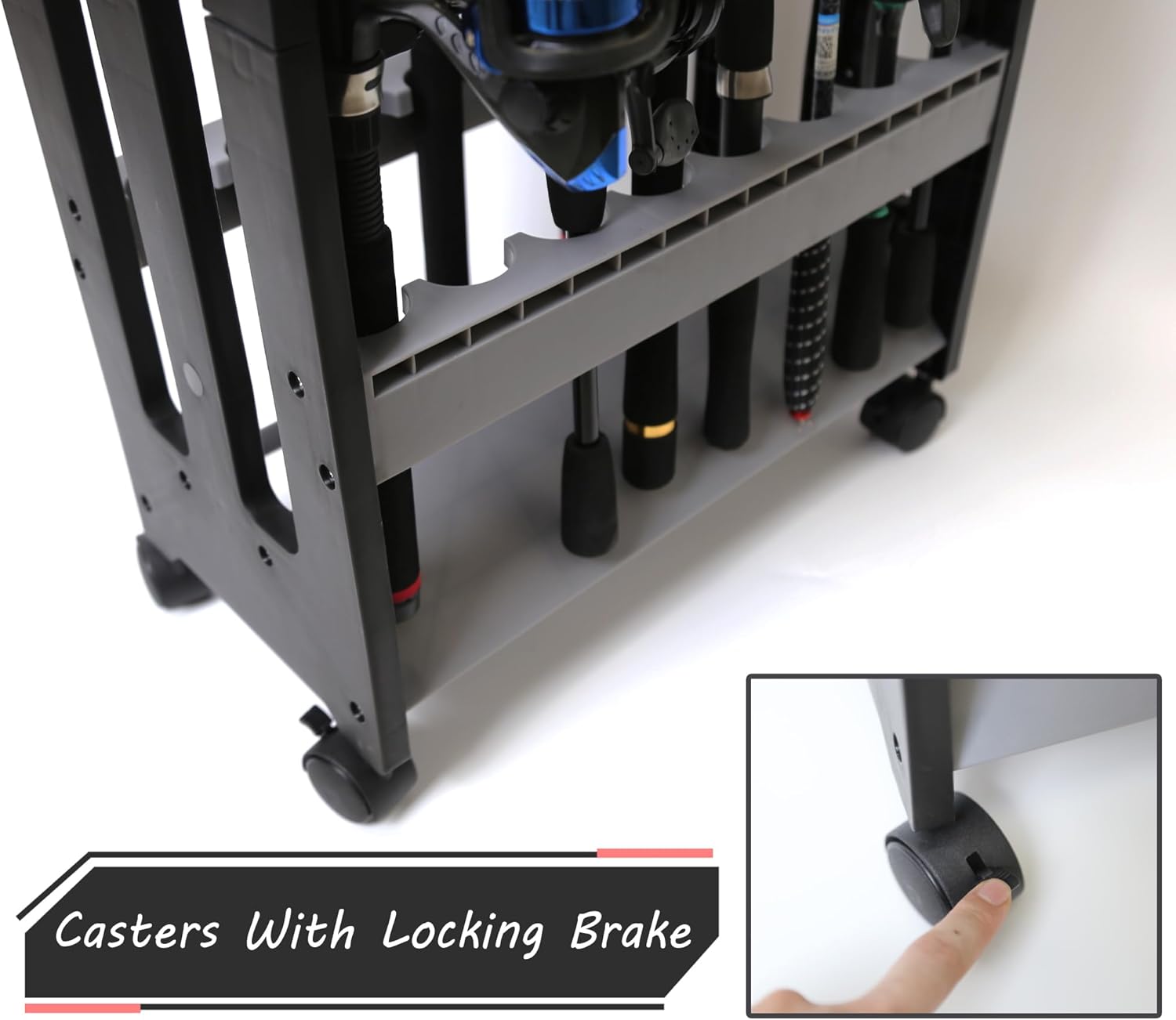 🎣【Perfect Fishing Gift for Men】This floor fishing rod rack on wheels is perfect for any style of home decor.Help you organize your fishing rod and fishing accessories in your garage,shed or another indoor or outdoor storage area.Perfect for fishing lovers,simple and practical,the best fishing gift for men,women, dads,husbands,and boyfriends on special days!