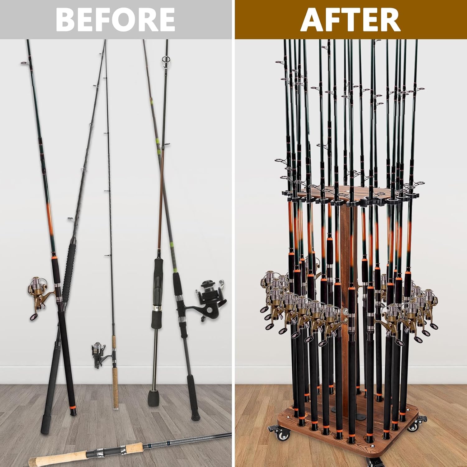 Fishing Rod Holders for Garage, Fishing Pole Holders with Rolling Wheels, Wooden Floor Stand Holds Up to 24 rods, Fishing Pole Rack, Fishing Gear Equipment Storage Organizer, Fishing Gifts for Men