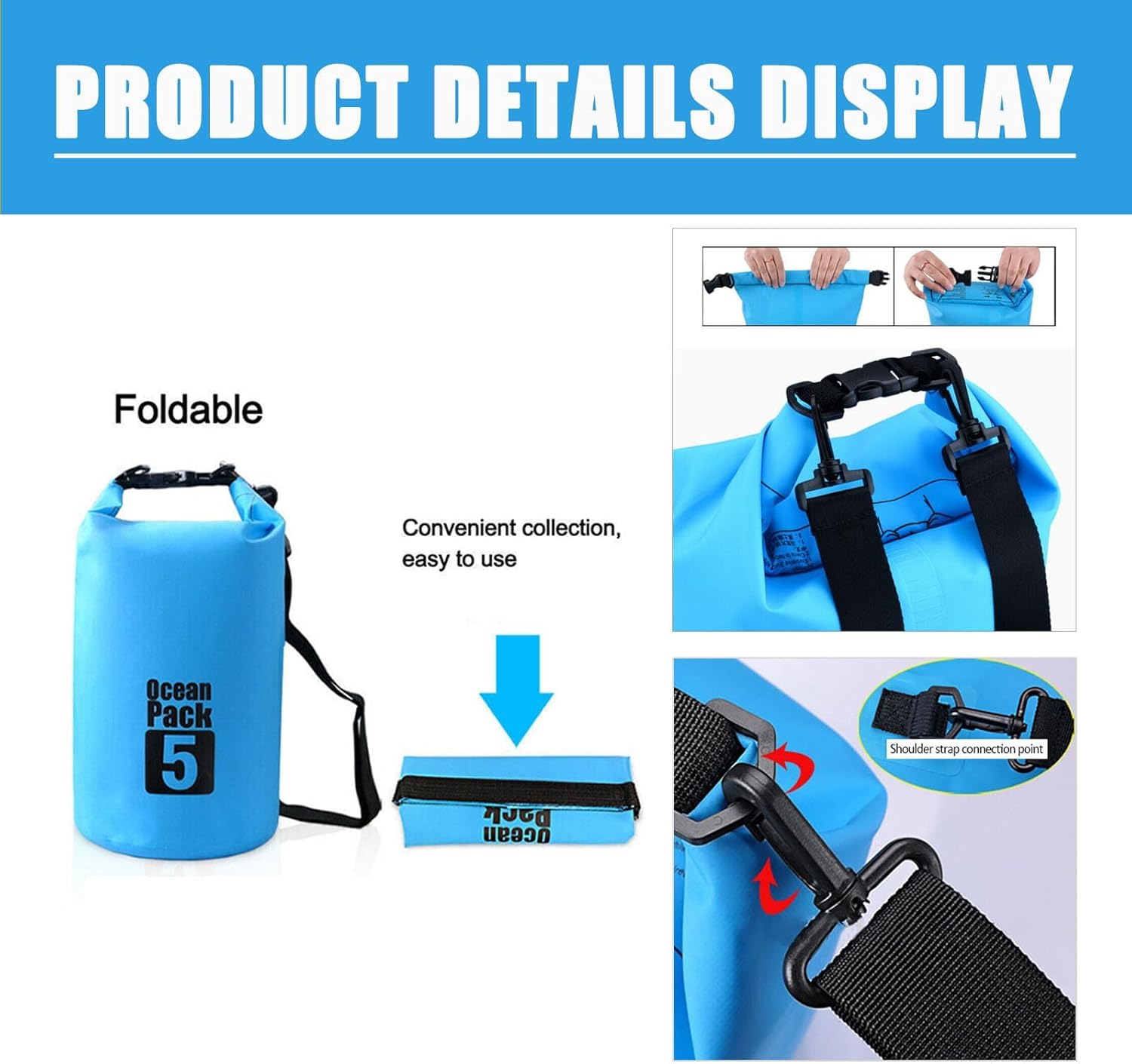 Superior Waterproof Protection: Crafted from durable 500D PVC material with welded seams, our dry bag offers unparalleled waterproof protection for your gear. The roll-top closure system with secure buckle ensures a watertight seal, keeping your belongings dry during any water activity or in harsh weather conditions.