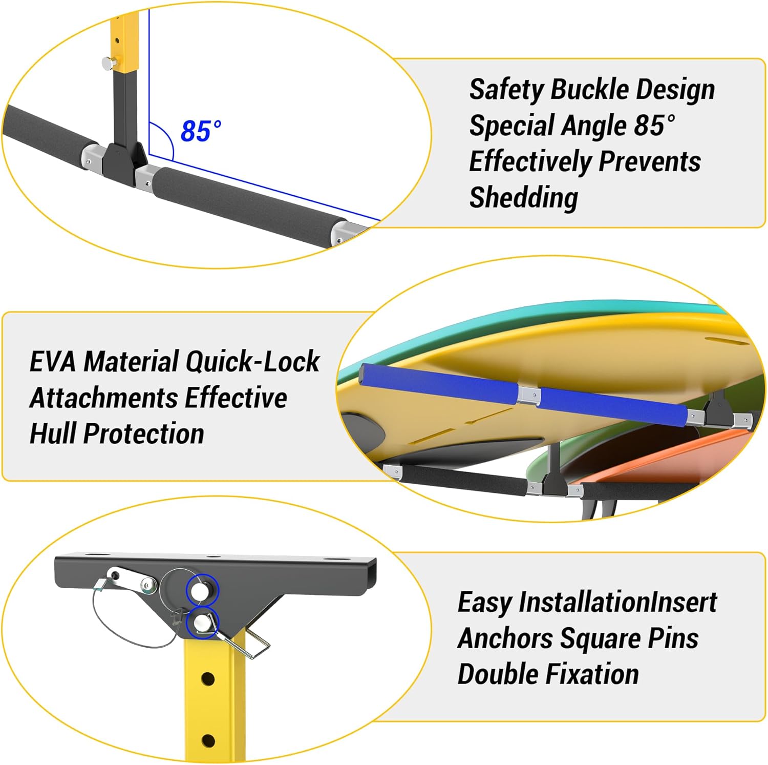 Durable Steel Construction: Our kayak storage rack Hanger showcases robust steel arms designed to shield your kayak, boards, and so on. Accompanied by a sturdy steel frame and rigid 85-degree angled arms. This configuration ensures optimal support and prevents sagging