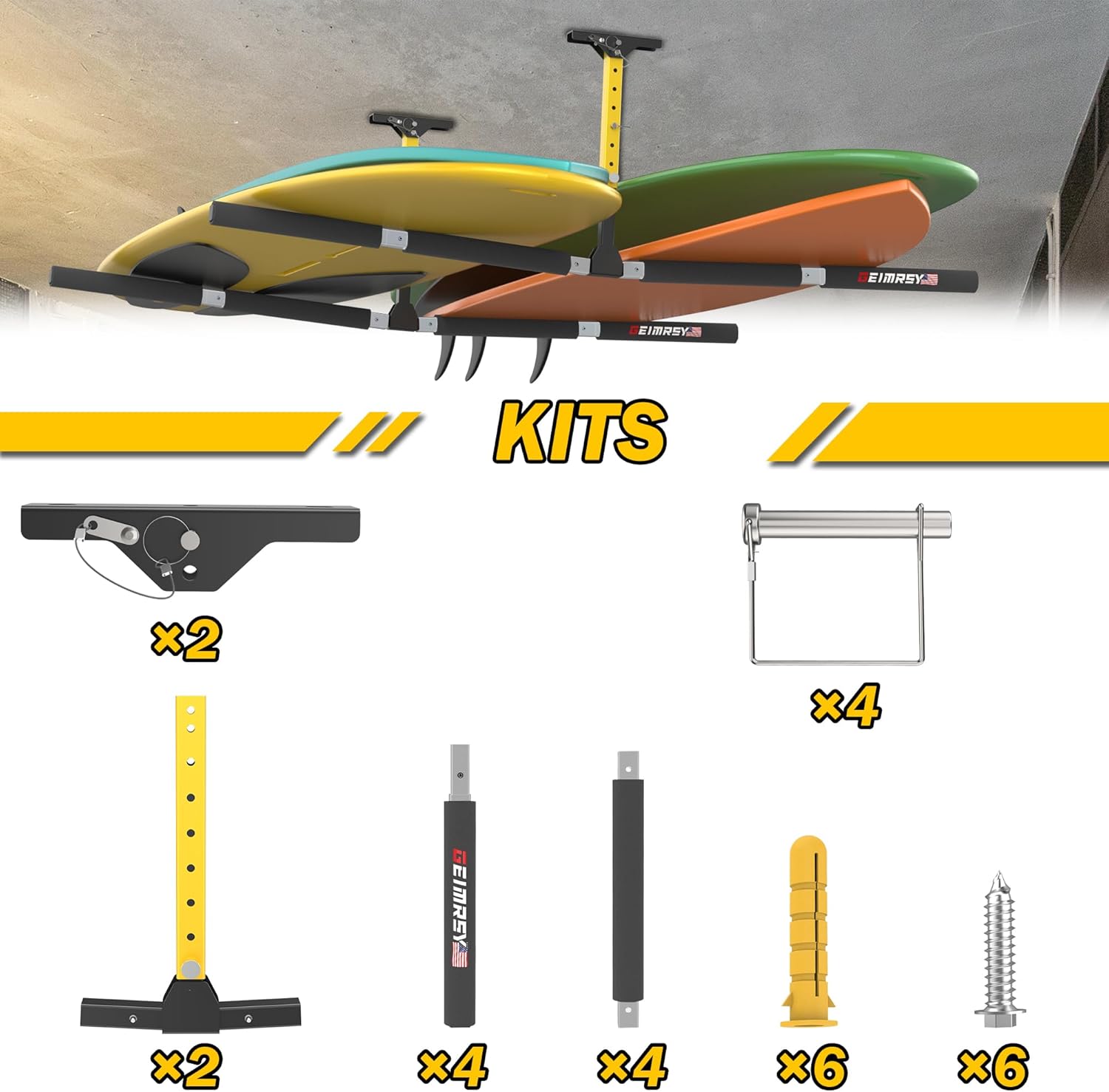 Versatility: The ceiling storage hanger suitable for storage a various items like ladders, kayaks, SUP and SKI. The rack’s adjustable height (12.6-20.8 inches) accommodates different sizes and shapes of items
