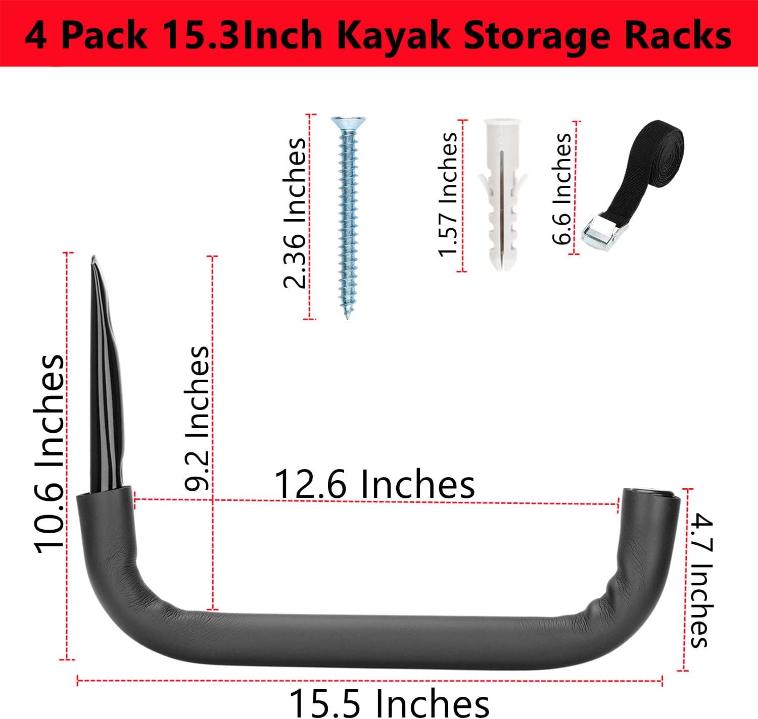 【SIZE & CAPACITY】4 pack kayak storage hangers is 15.5Inch x 10.6Inch(L x H) , the diameter of the tube is 1Inch, max holds up to 100 lbs. There are 8pcs screws + 8pcs anchors + 2pcs adjustable lashing straps inside.