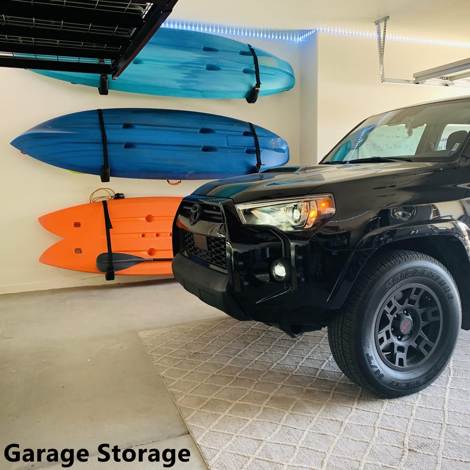 【With 2pcs Straps】6.6ft strap is made of high, density nylon material, strong and durable. you can organize hoses, cords and ropes in garage storage hooks, secure your ladders and kayak and bulky items will nor fall out of the hanger.