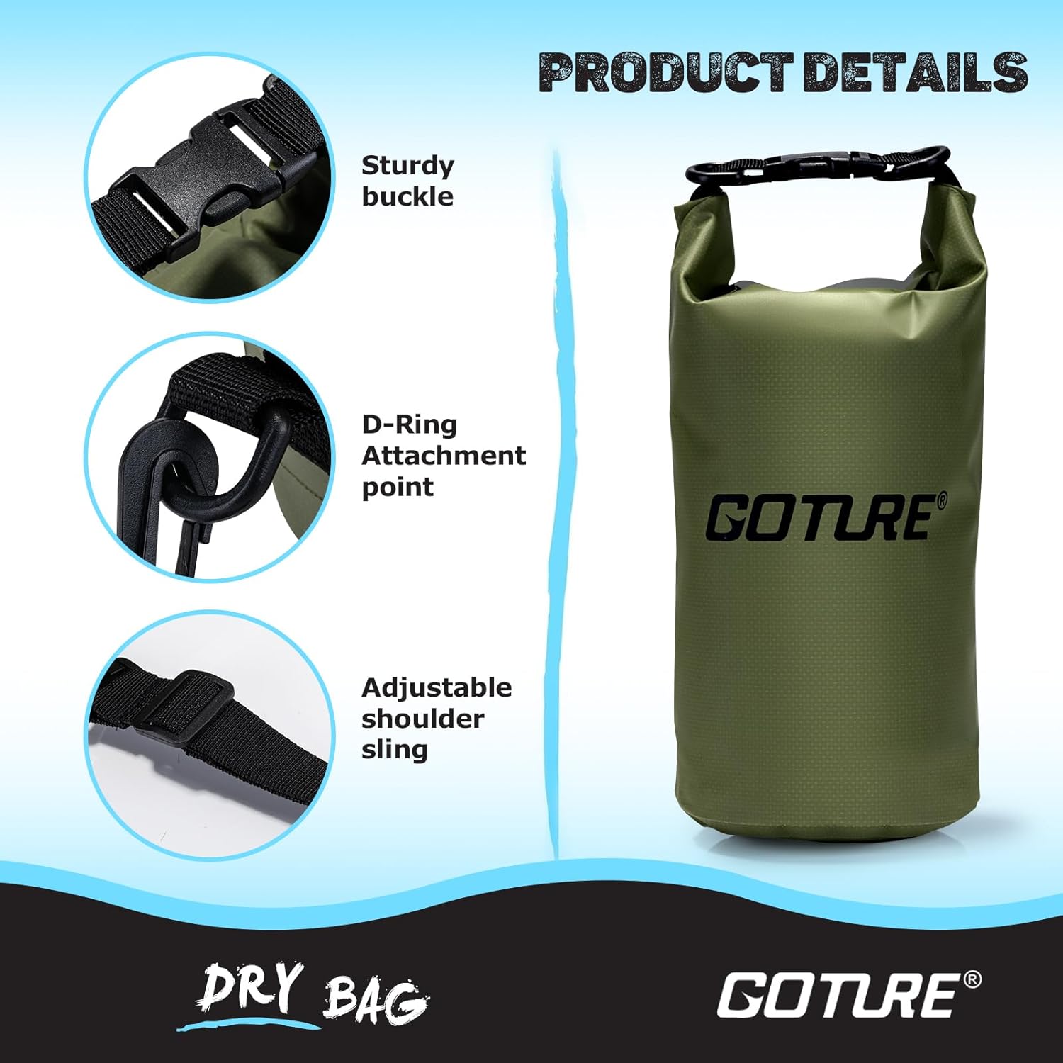 500D PVC Waterproof Bag: Goture dry bag is constructed from heavy-duty 500D PVC, ensuring strong waterproof, dust-proof, and tear-proof performance. This lightweight dry bag protects your gear from rain, snow, dirt, dust, or sand