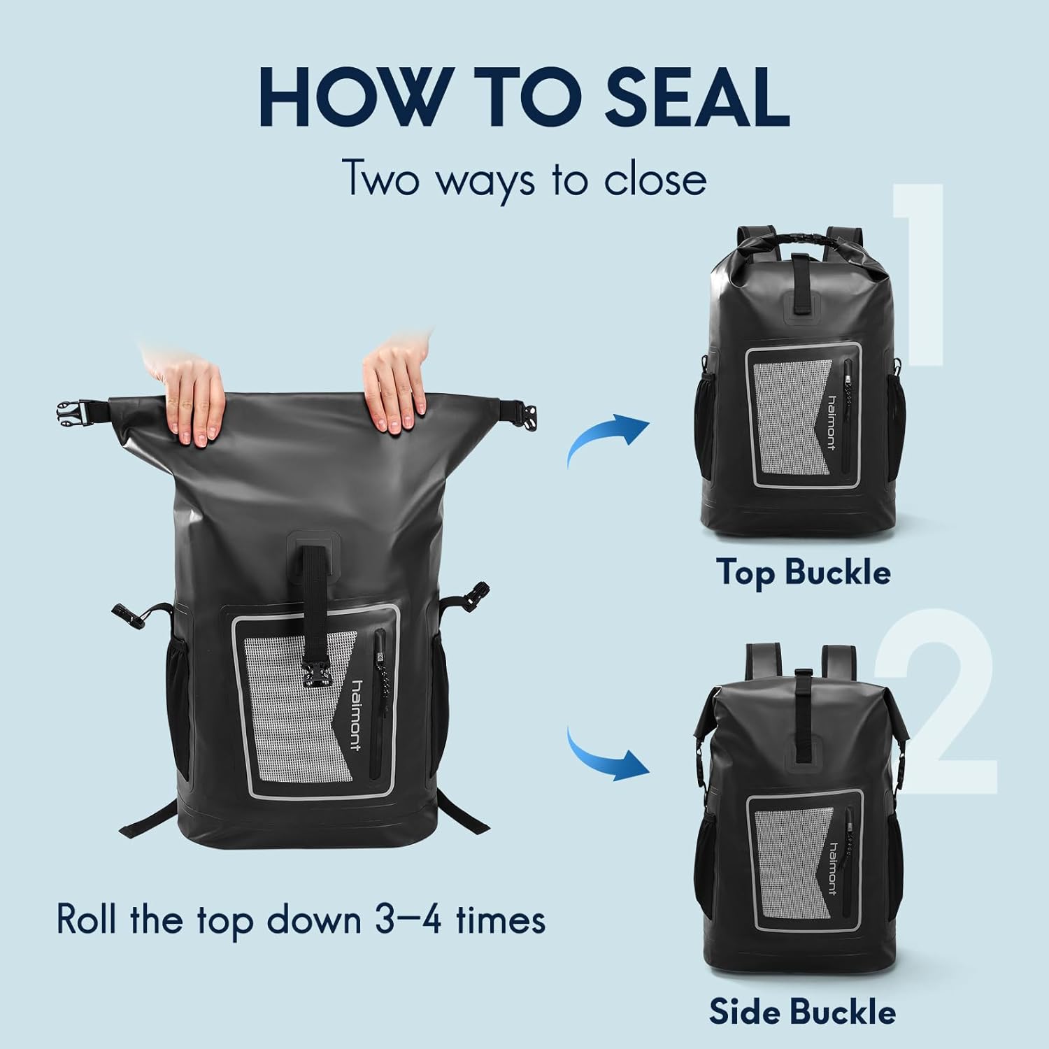 COMPLETE WATERPROOF PROTECTION: Haimont waterproof roll top backpack is made of 500D heavy duty waterproof material with welded and heat taped seams. Roll top closure ensure no water, dirt, dust or sand into the dry backpack and keep your stuff completely dry and clean inside in all types of environments