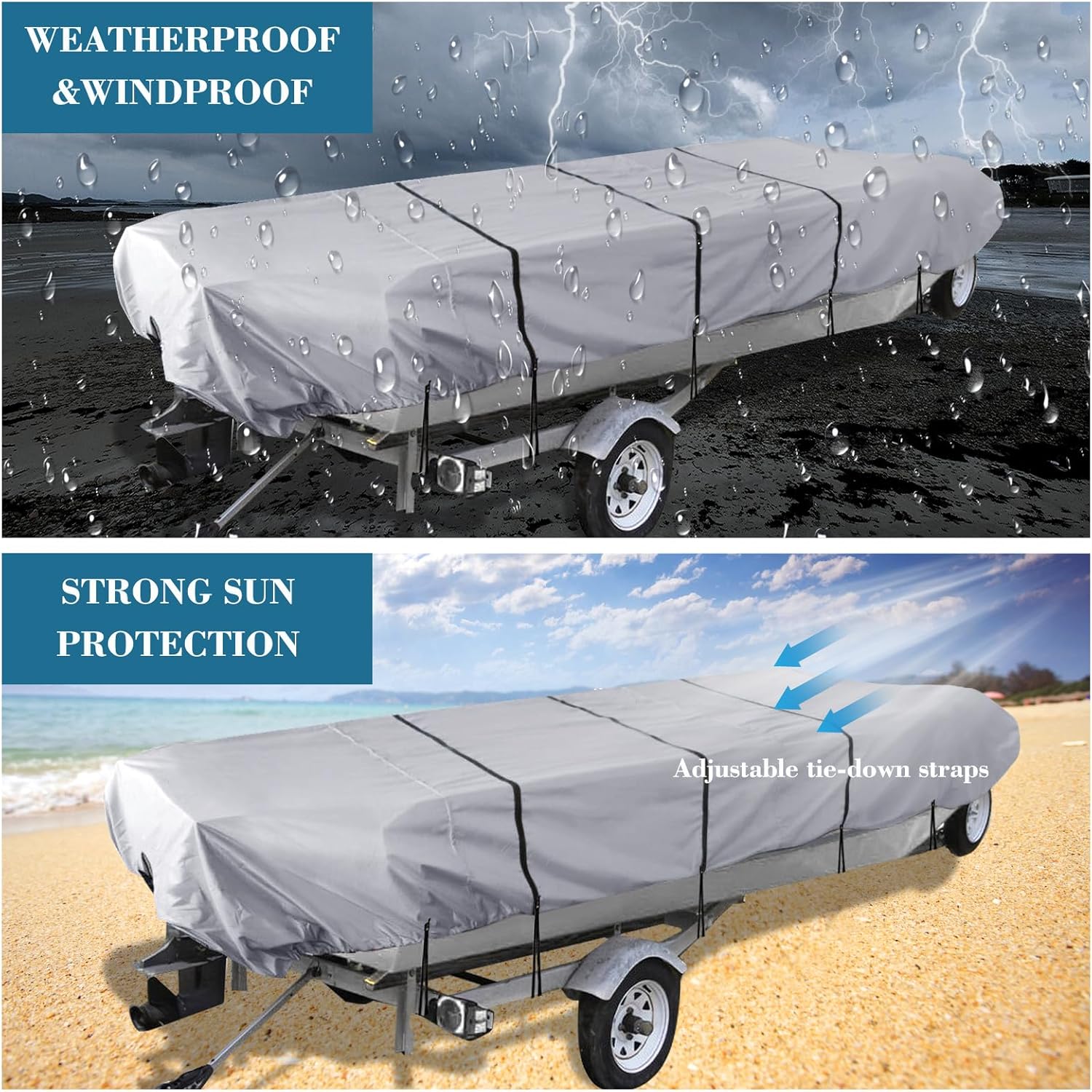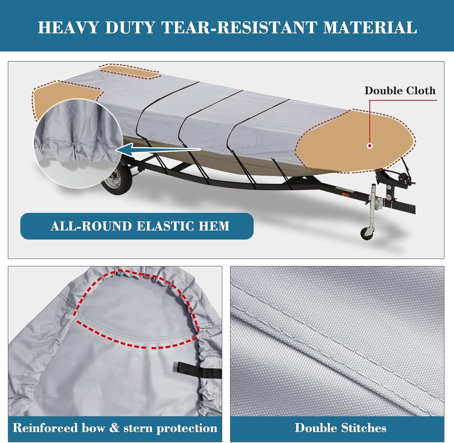 100% DOUBLE-SIDED WATERPROOF: This jon boat covers is enhanced with 3 layers water resistant PU coating on the backside which can withstand up to 2000 pa water pressure, while we also have the waterproofing properties on the front-side to make it double sided waterproof. It helps prolong the lifespan of your boat in complex and changeable outdoor conditions.