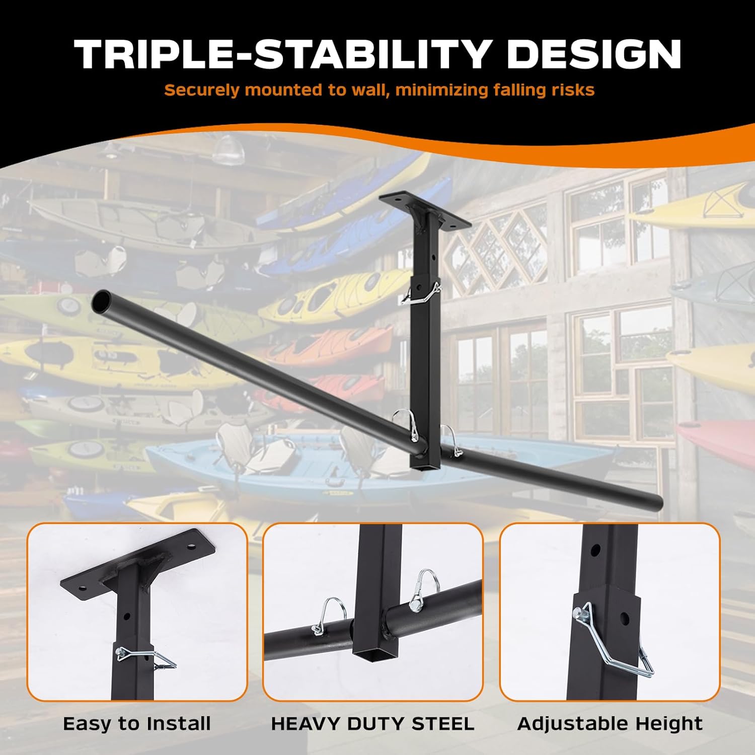 Made from high-quality heavy-duty steel, this rack is built to handle up to 150lbs of weight (75 lbs per side), ensuring secure and reliable storage for your kayaks.