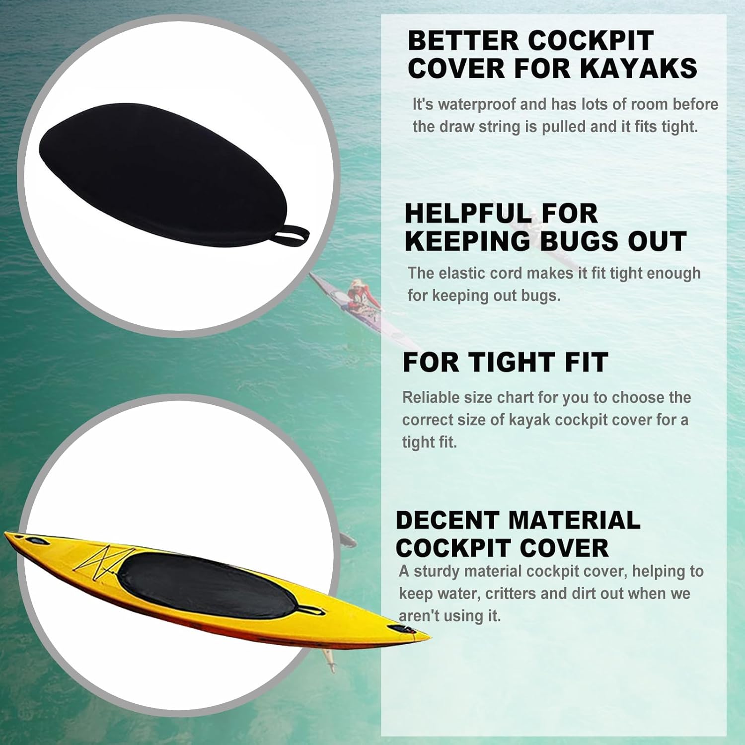 Tear-resistant, dust-proof and waterproof 420D oxford material with PVC coating kayak cockpit cover.Keeps your kayak cabin clean and dry.