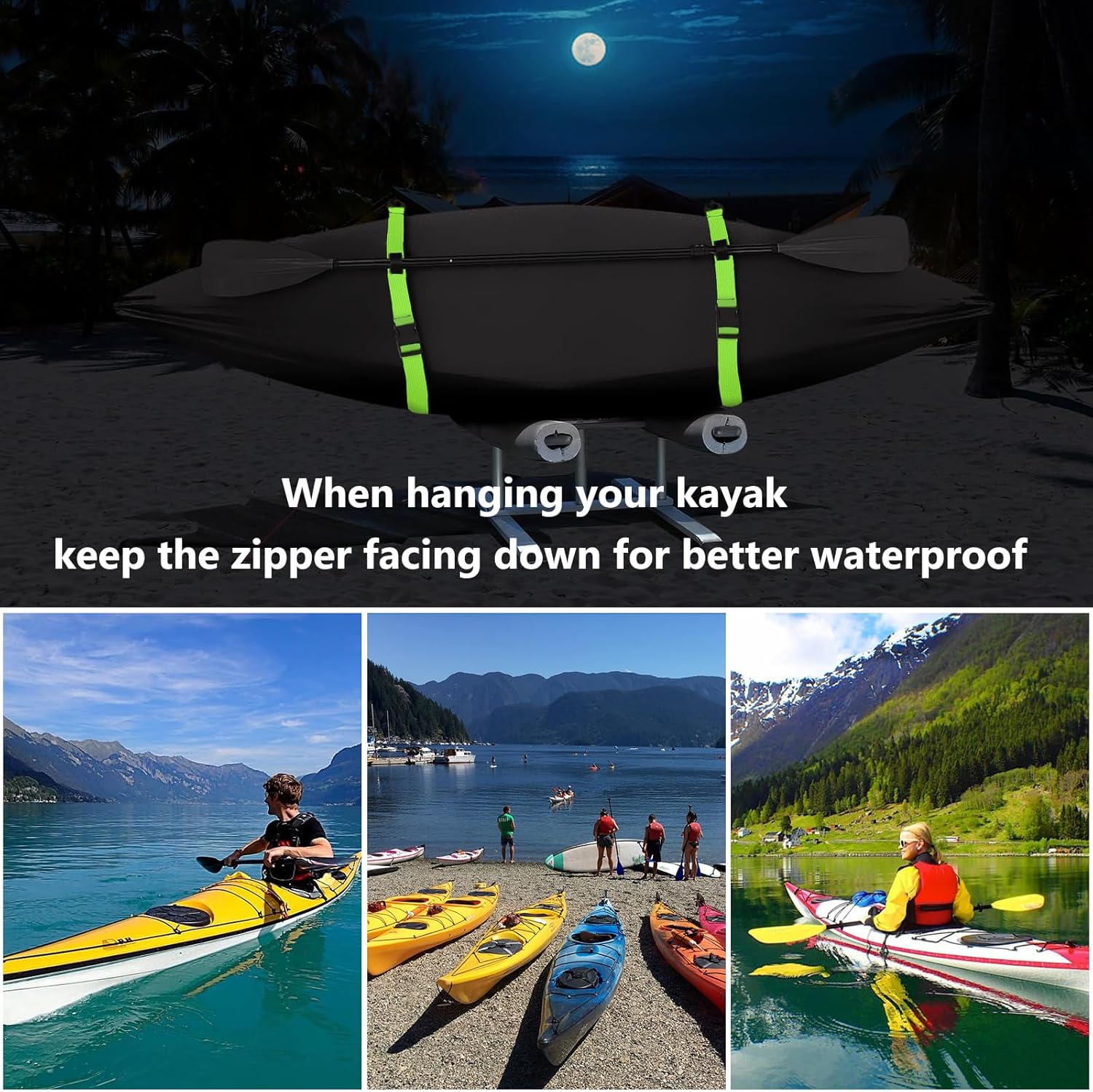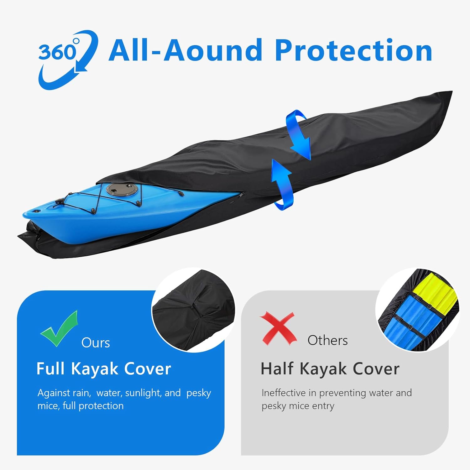 【Full Wrap Design】Unlike other products, our kayak cover boasts a fully wrapped design that envelops the entire kayak, ensuring comprehensive protection against rain, water, sunlight, and even pesky mice. This ensures your kayak stays in top condition for longer periods.