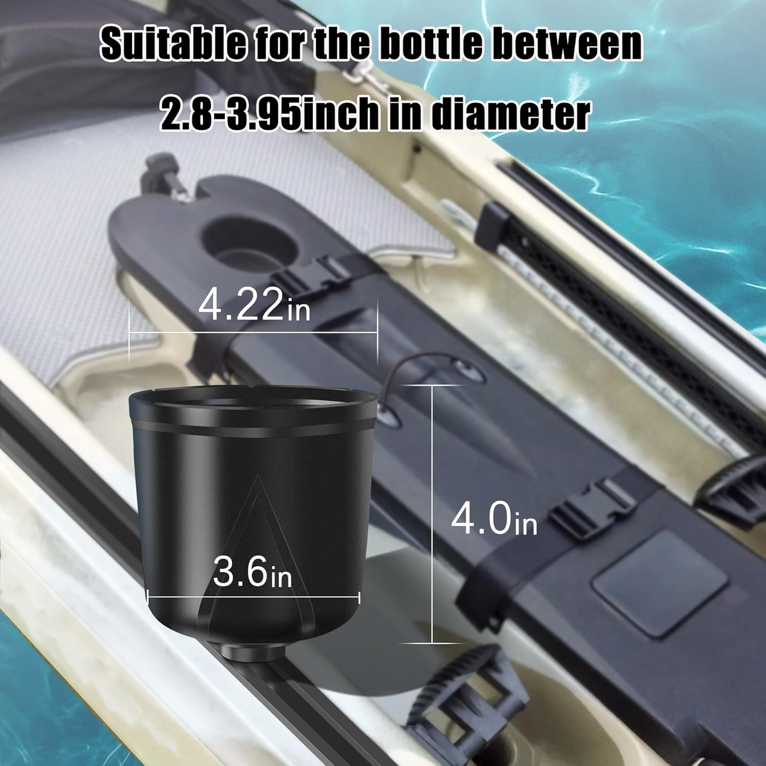Universal Compatibility: The kayak cup holder is designed to accommodate a variety of can, bottle, and cup sizes. It is suitable for various different size beverage containers.The inner diameter of the rim measures slightly less than 3.875 inches, gradually narrowing down to approximately 3.6 inches at the bottom.