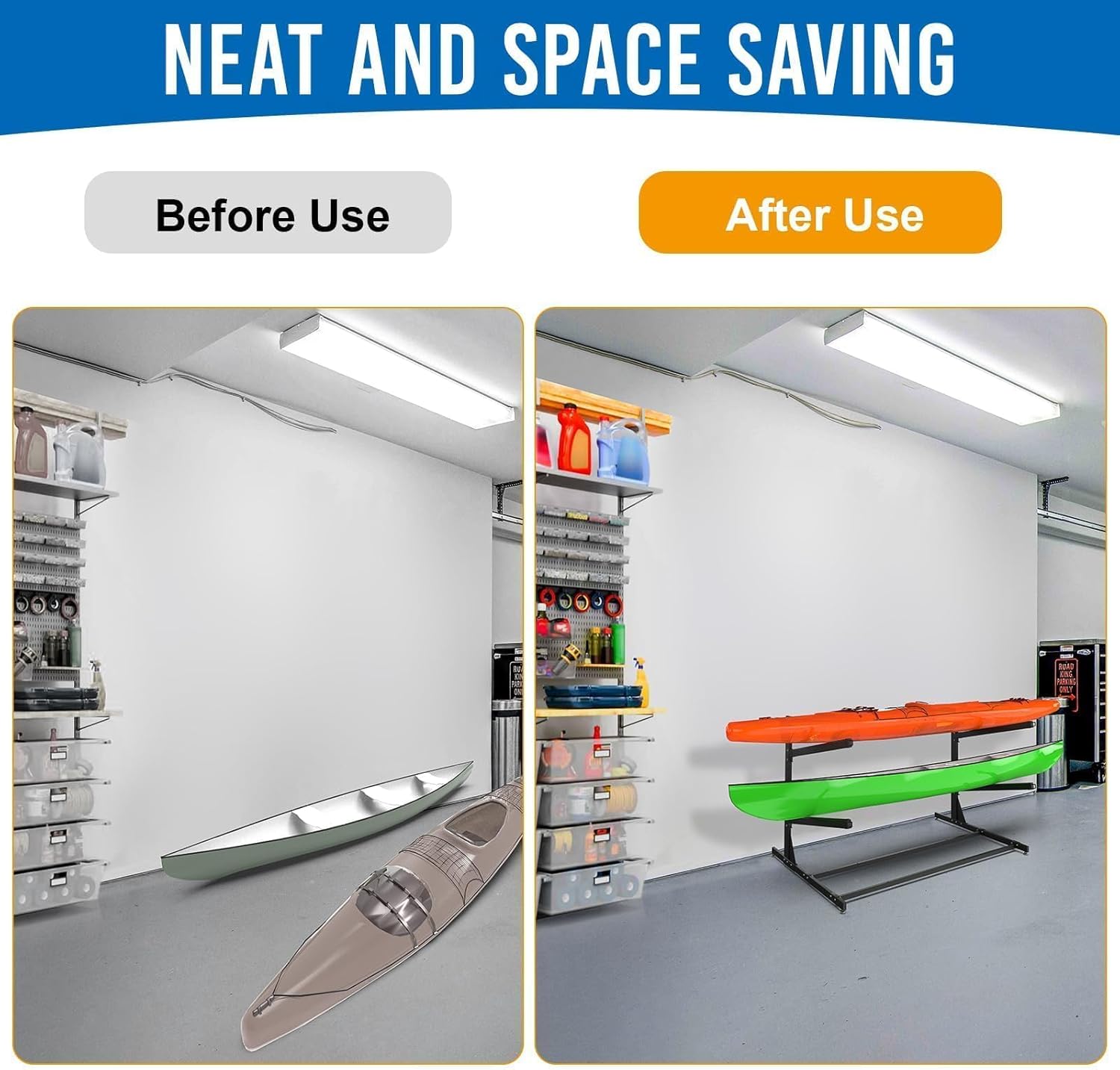 NEAT & SPACE SAVING: Assembled 2-tier kayak rack measuring 46″L x 36″W x 28″H, can accommodate 2~3 kayaks or other sports equipment. Kayak racks can be a huge space saver by keeping your kayaks and other water equipment neatly stored. This organized arrangement not only makes equipment easy to find, but also reduces clutter and keeps the storage area tidy.