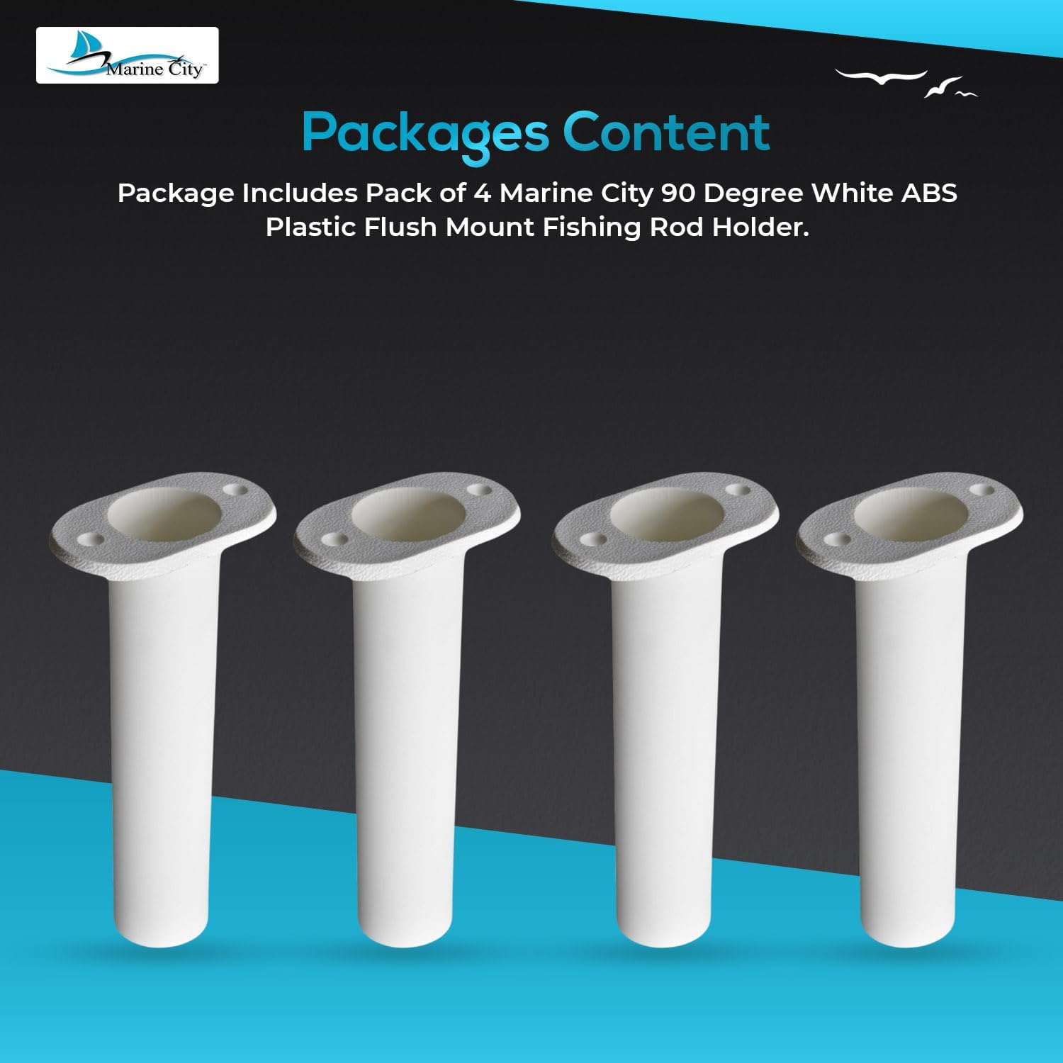 Package Includes: 4 Marine City 90° White ABS Plastic Flush Mount Fishing Rod Holders.