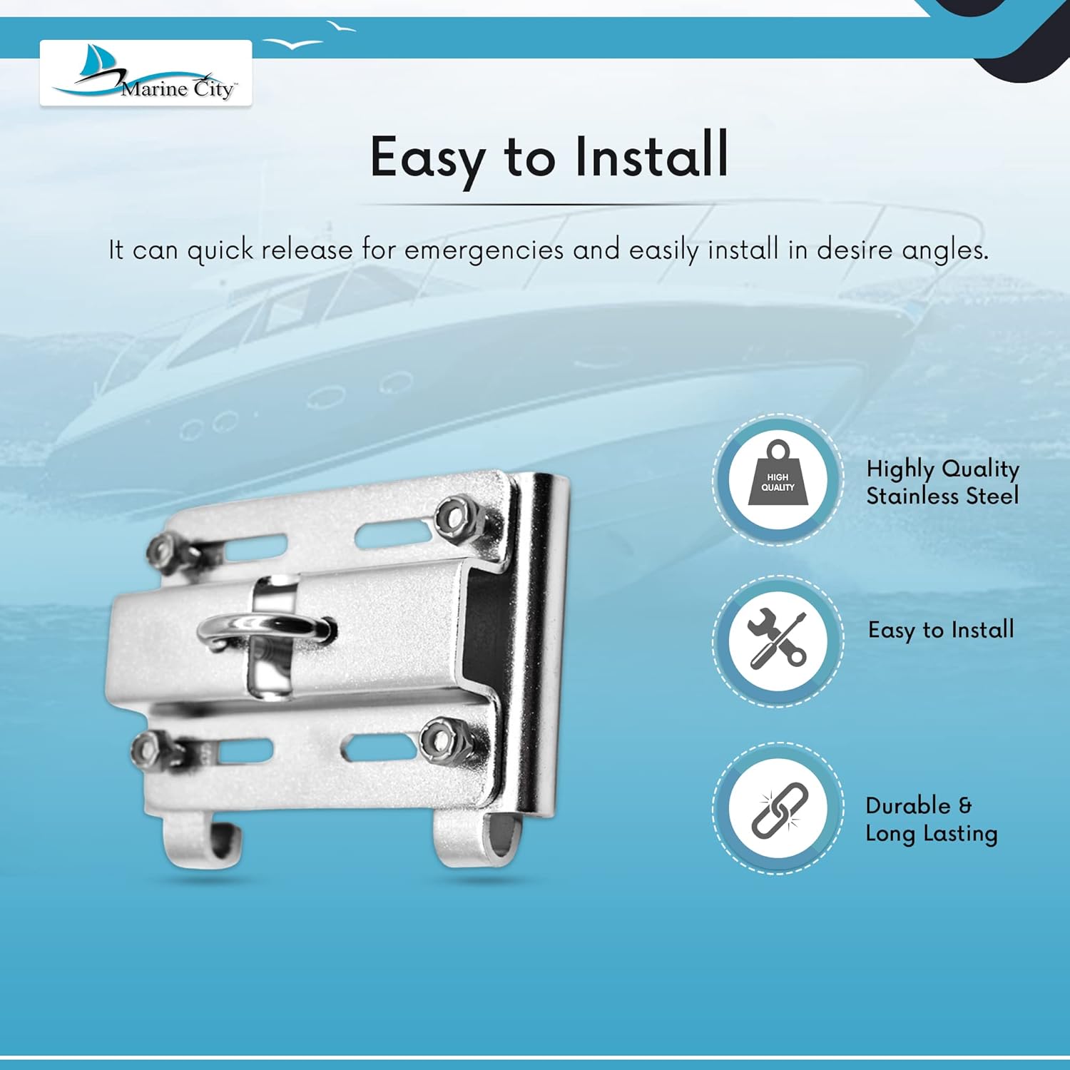 It is very easy to install, can be swiftly released in an emergency and readily installed at desired angles, strong and sturdy fine finish with innovative an design for boats yachts and marines.