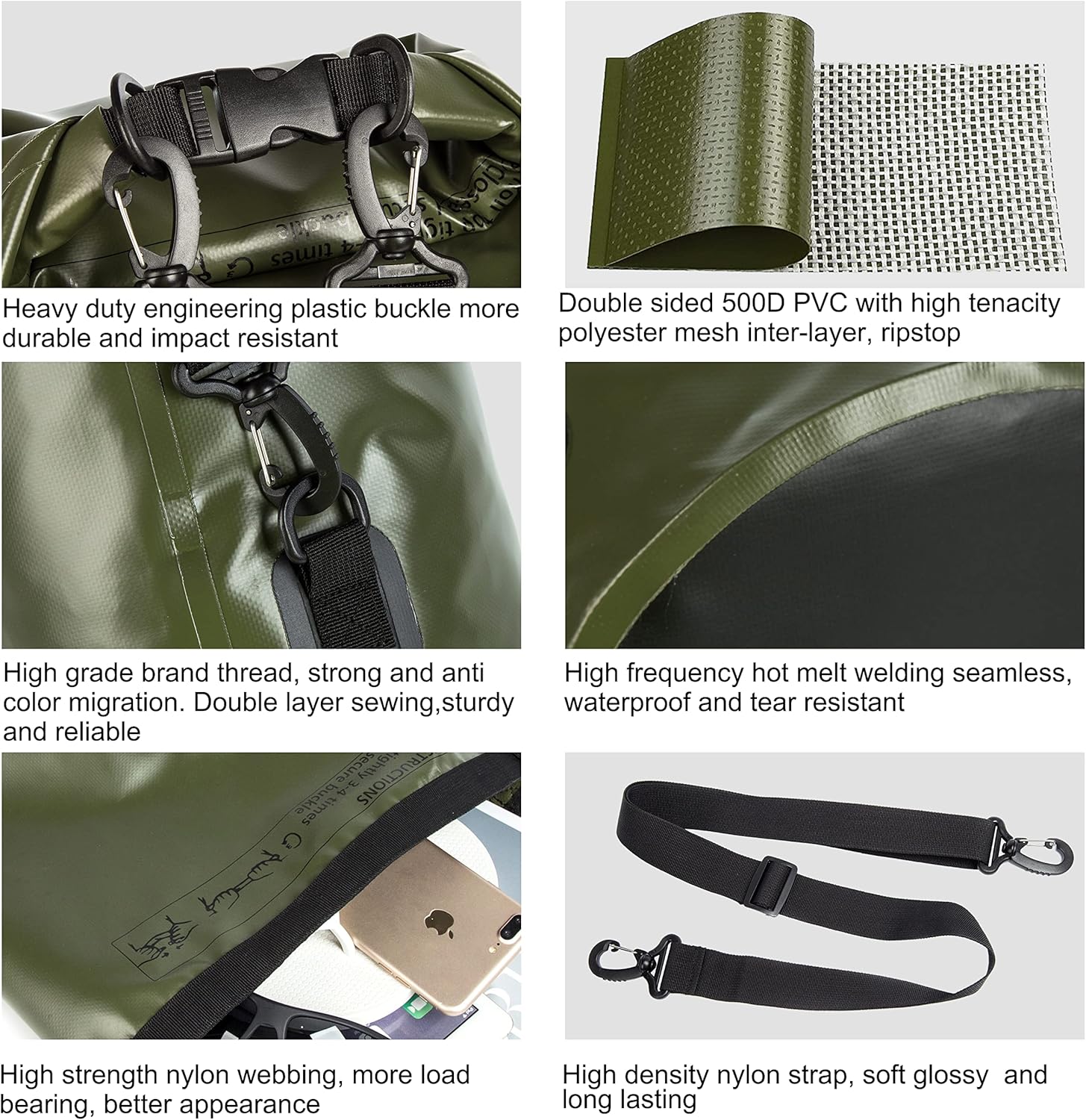 Simple Operation: Designed with a roll-top closure and single reinforced strip to ensure water stays out.Simply fold the bag down 3-4 times,then align the straps on the top of the waterproof dry backpack after stores your gear, and connect each side buckle of the dry backpack to complete the seal.