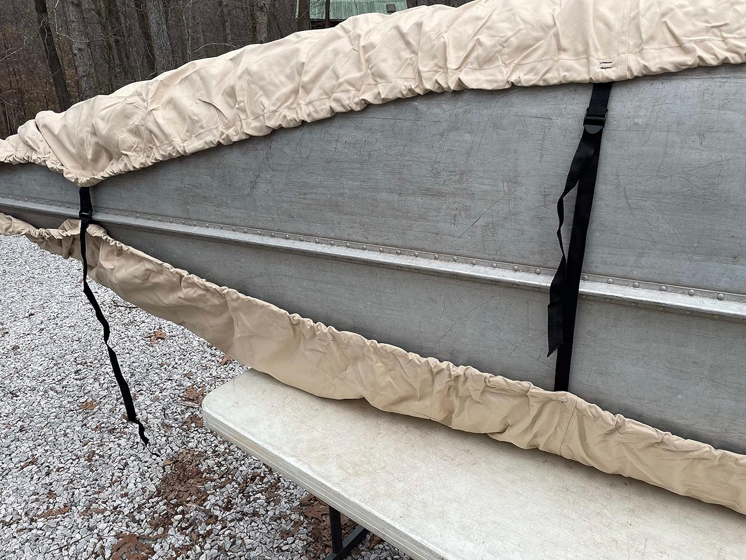 Our material is a woven canvas, but the threads from which it is woven are polyester. The purpose of this cover is threefold. One is to cover and protect your investment. Covered vs uncovered is night and day. The value of a good cover is intrinsically obvious each time you uncover your canoe/kayak. Just think about in the spring when you break it out for the first time and do not spend half a day cleaning leaves and spider webs out of it, a good cover earns its keep! The second purpose of this cover is to provide you with a cover that will not be lying shredded in your yard next year. The third is to help the environment just a tad. We do this by not offering cheaply made covers that end up unusable and in your local landfill. Here is what you want… a cover to protect and keep your investment clean while not buying a new cover every year because your previous purchase is deteriorated to dust held together by weak deteriorated strands of weathered material… Our covers are not just waterproof, but Nature Proof. Our canoe/kayak covers are engineered to protect against water, the sun, tree residue (sap and leaves and stains), etc. Our covers can be used and secured in multiple ways, based on your specific circumstances. They come with a hidden bungee style cord in the hem, for a quick on and off cover. Now, if you want to kick it up a notch, in the front, this hidden bungee style cord has an adjustor, so you can customize the fit. They also have built in straps.