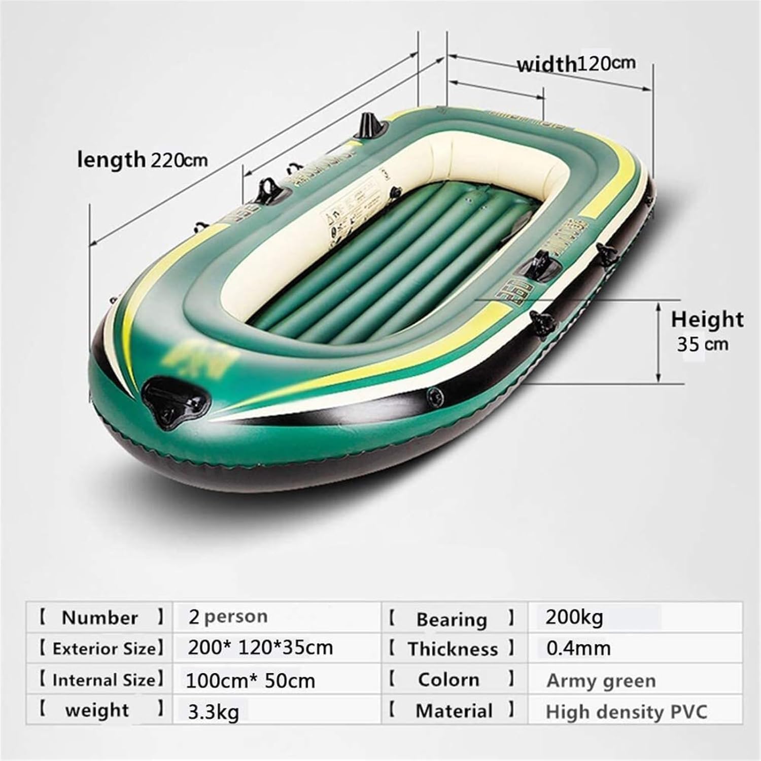 1. This heavy duty boat adopts good quality PVC material, thickness up to 0.4mm, airtight and wear-resistant. 2. Inflatable design; easy to fold for convenient storage and transportation. 3. With two paddle mounts, it can hold paddle for labor-saving paddling. Specification: Material: PVC Color: green Suitable for: 2 person Load Bearing: 200kg Size: approx. 220*120*35cm Weight: Approx. 3.3kg Packing List: A : inflatable boat; If you have questions, please ask our customer service and we will answer them for you!