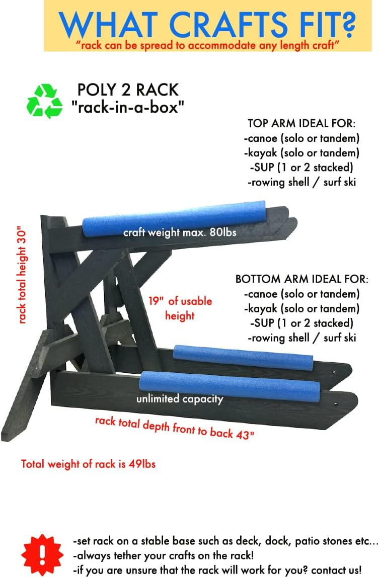 Use Anywhere: Your kayak storage rack, canoe rack or SUP rack solution can be used indoors or outdoors. Simply set up your rack on a stable surface such as a dock, deck, concrete pad or even patio stones and get your crafts up off the ground.