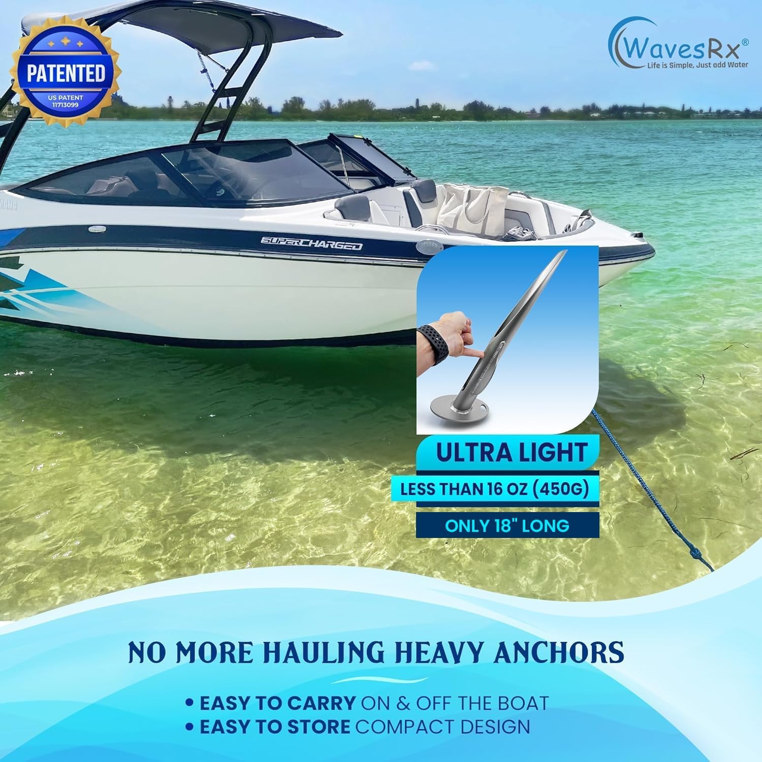 NO MORE HAULING HEAVY ANCHORS TO THE BEACH! – Your back will definitely thank you for this one. Weighing less than 16 oz, the WaveCobra aluminum anchor is Ultra Light so you can easily carry it on and off the boat. And thanks to its specially engineered, patented shape (US PATENT 11713099), it will stay in one place until you are ready to pull it out – a process that is both Quick and Effortless.