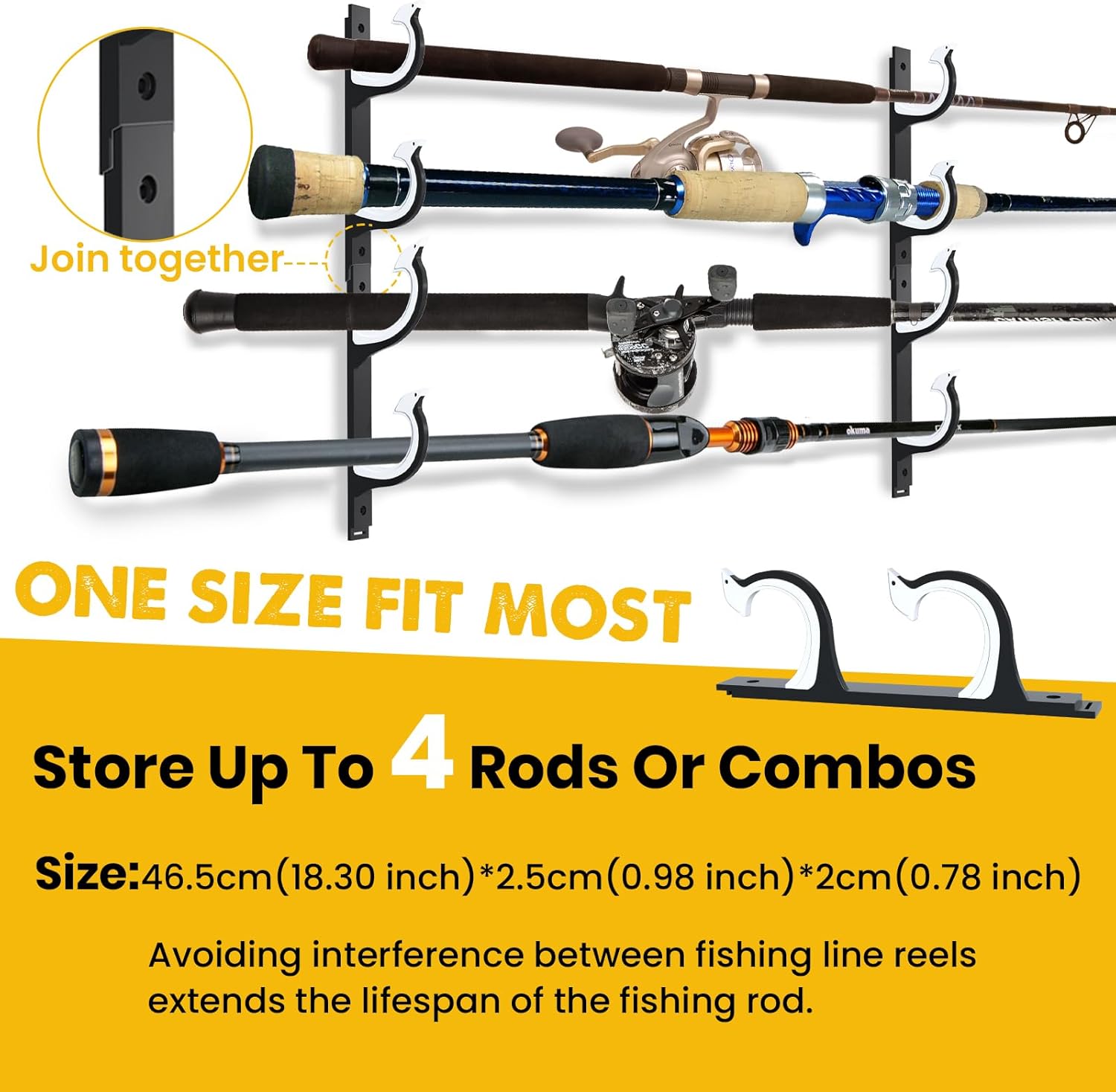 ULTRA-LIGHT PLASTIC FISHING ROD HOLDER: Innovative design that ensures secure, organized, convenient, and damage-free rod storage. Features protective padding to prevent damage. Dimensions: 46.5cm (18.30 inches) * 2.5cm (0.98 inches) * 2cm (0.78 inches). (Allows you to connect multiple holders together for added convenience)
