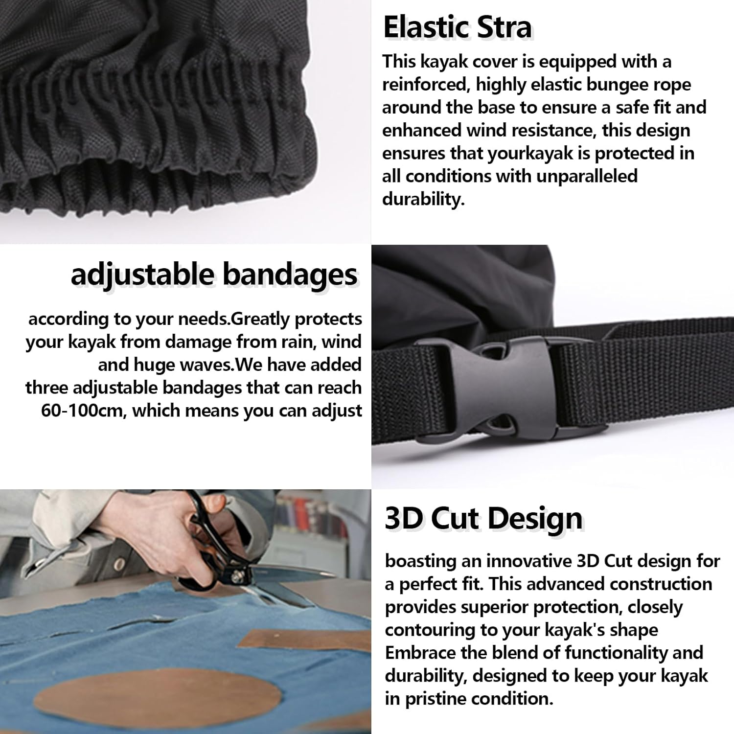 【Durable material】 Made of polyester with waterproof PU coating,durable, non-fading, anti-ultraviolet, and 100% waterproof suitable for outdoor and indoor use. It’s easy to clean, hard to scratch or tear, and lasts a long time,maintaining your Kayak pristine condition.and this kayak cover can prevent UV rays properly even in the midsummer sunshine. The cover body is durable, and can last a long time.