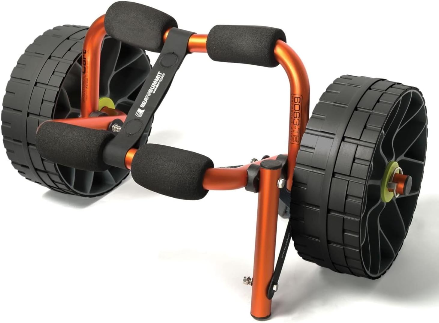 Small cart best suited for kayaks; depth is 8 inches, height with wheels is 12 inches, and weight is 6 pounds 5 ounces
