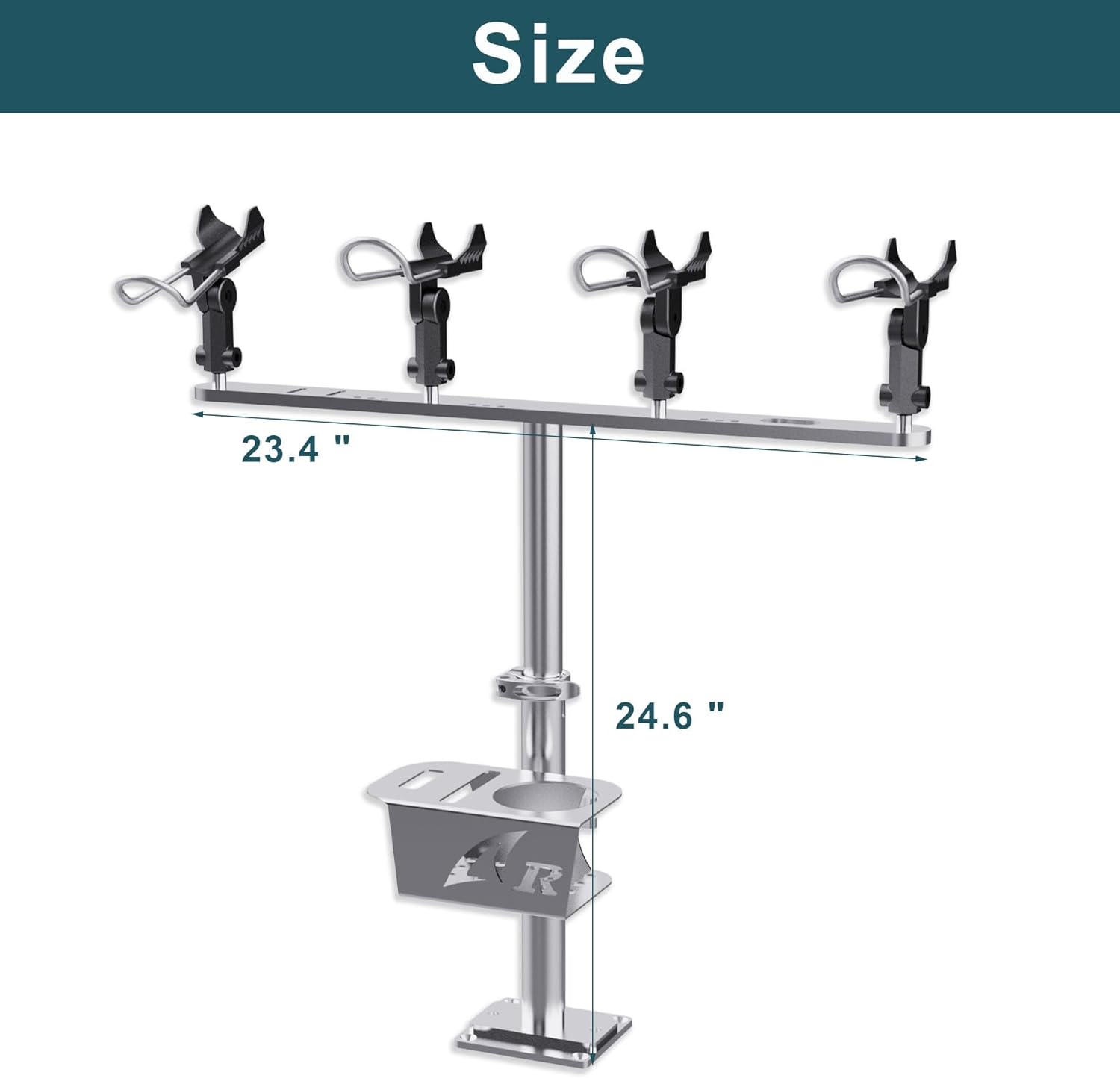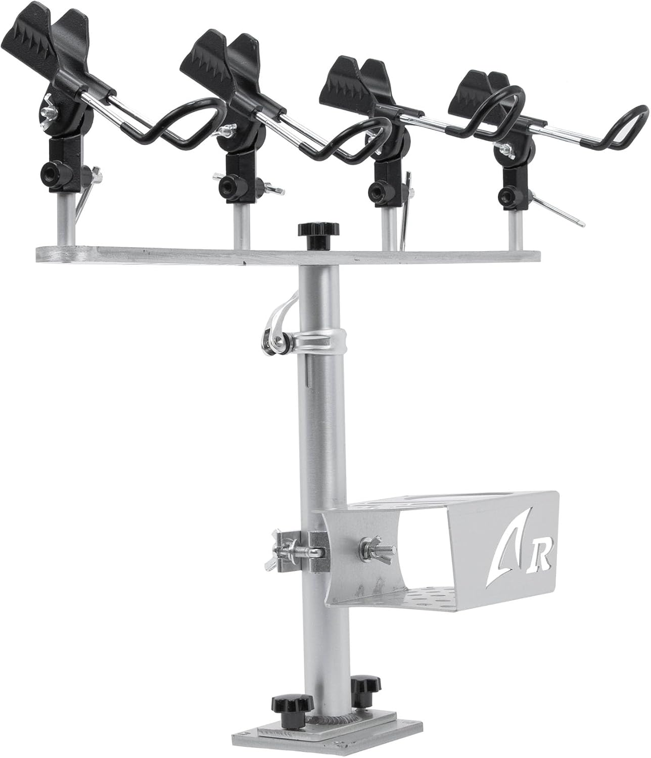 Holds up to 4 rods: The spider rig pole holder is designed to hold up to 4 rods with the exclusive height adjustable crossbar which measures 12” to 20”. The crossbar and each rod holder rotate 360° and these gears lock into place to securely hold you in place