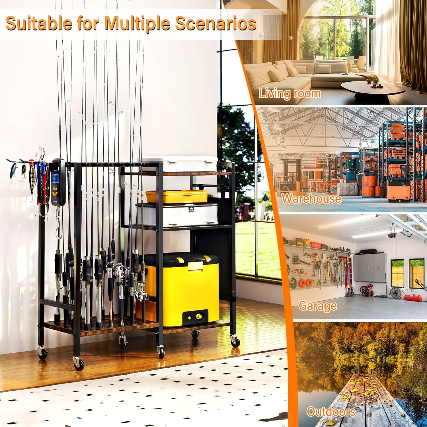 360° Mobile Fishing Pole Rack: Fishing rod rack is equipped with 6 universal wheels, 3 wheels have locking function, you can adjust and move the rod holder at any time, load capacity up to 400 pounds, easy to install and place in your garage, living room