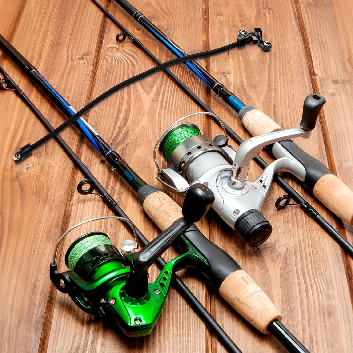 The fishing pole straps holders is about 18 inch long, can hold up to 4-6 pieces of fishing rods, and easy to adjust and cut the length to fit whatever installed area you have, just loose the collar part, pull the cord out, cut the desired length, slide the end back and lock it in position by collar.
