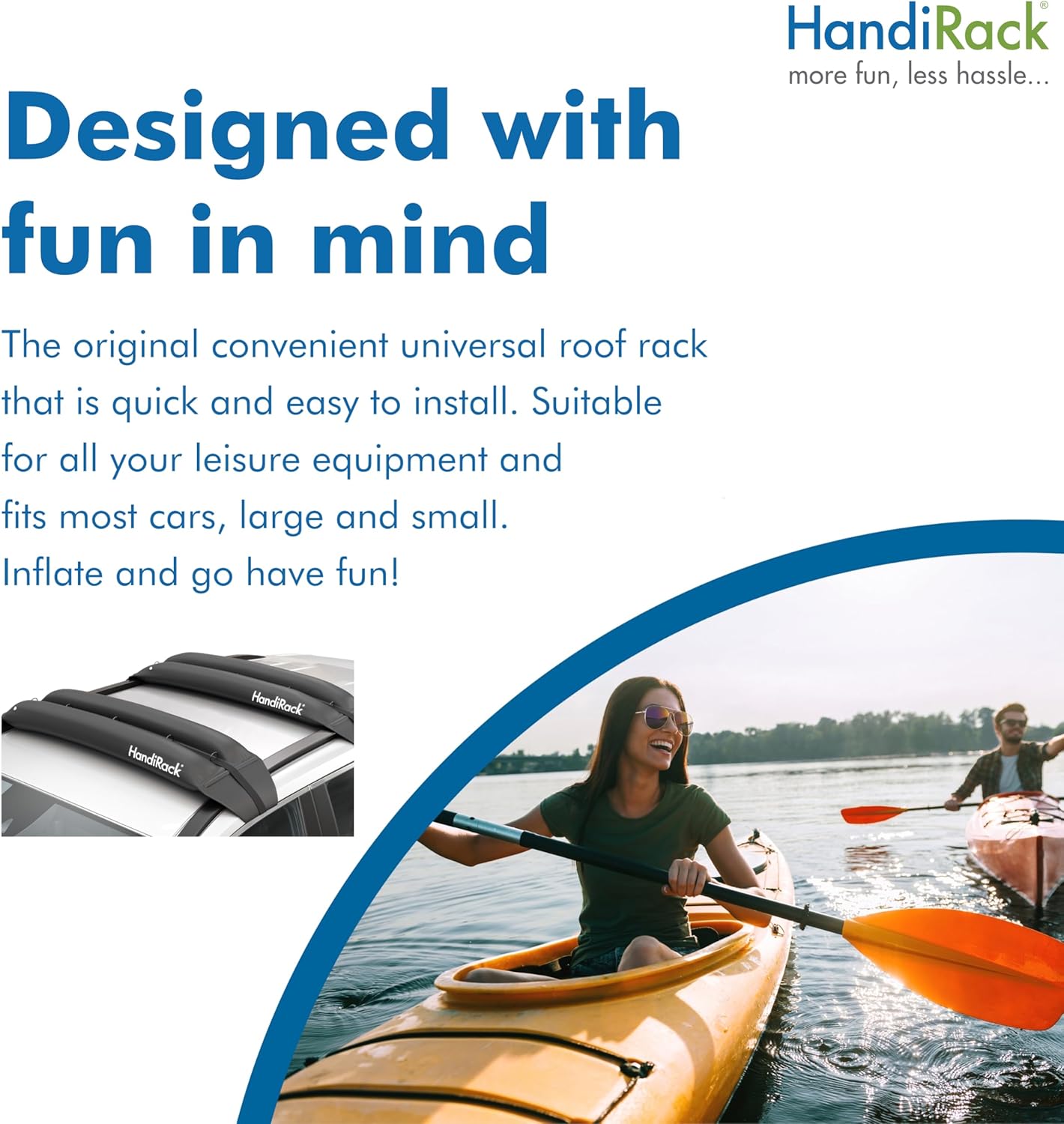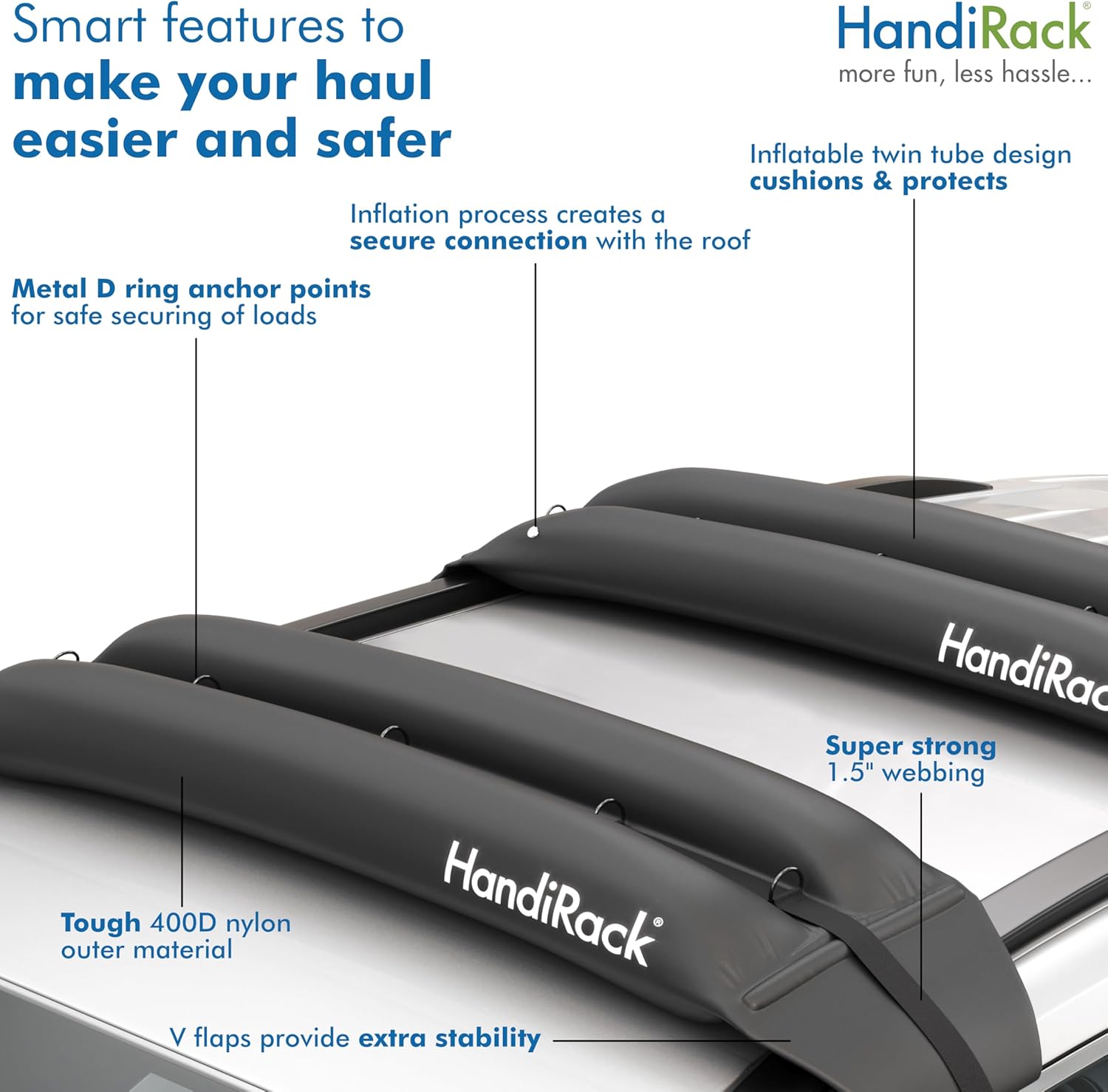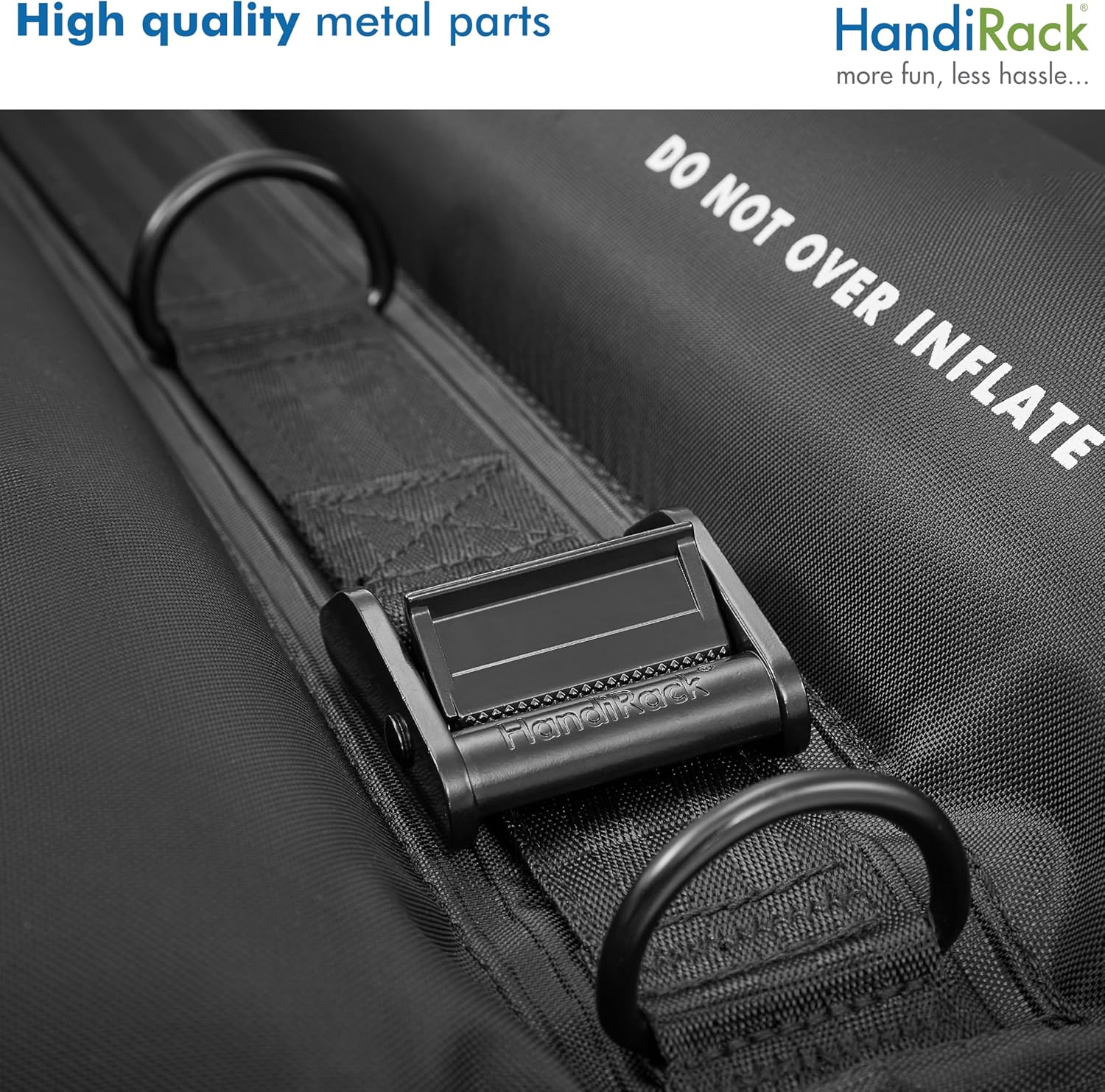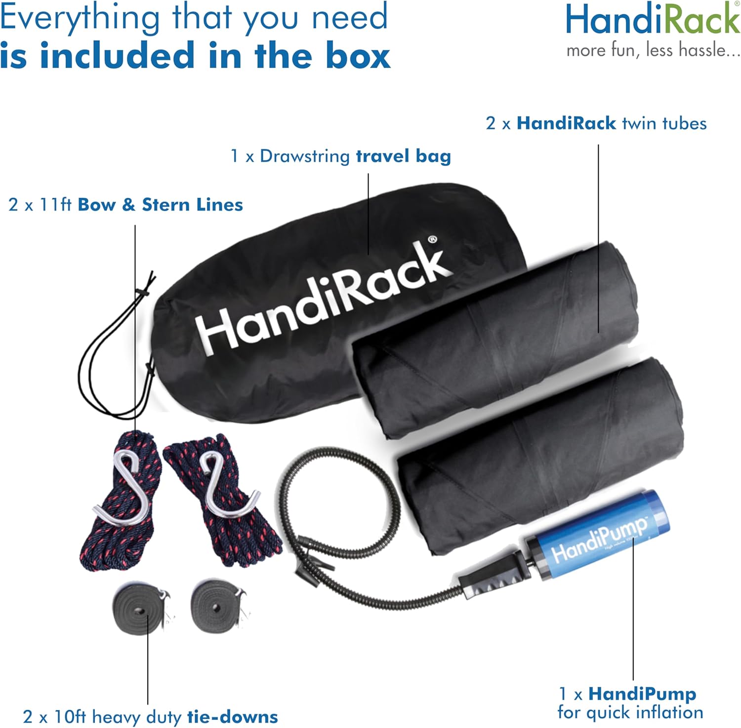 READY TO USE OUT OF THE BOX: Everything that you need is included; 2 x HandiRack twin tubes, 1 x HandiPump, 2 x 10ft tie-down straps, 2 x 11ft Bow and Stern Lines, drawstring storage bag and User Manual. Backed by a 1 year guarantee against manufacturing defect.
