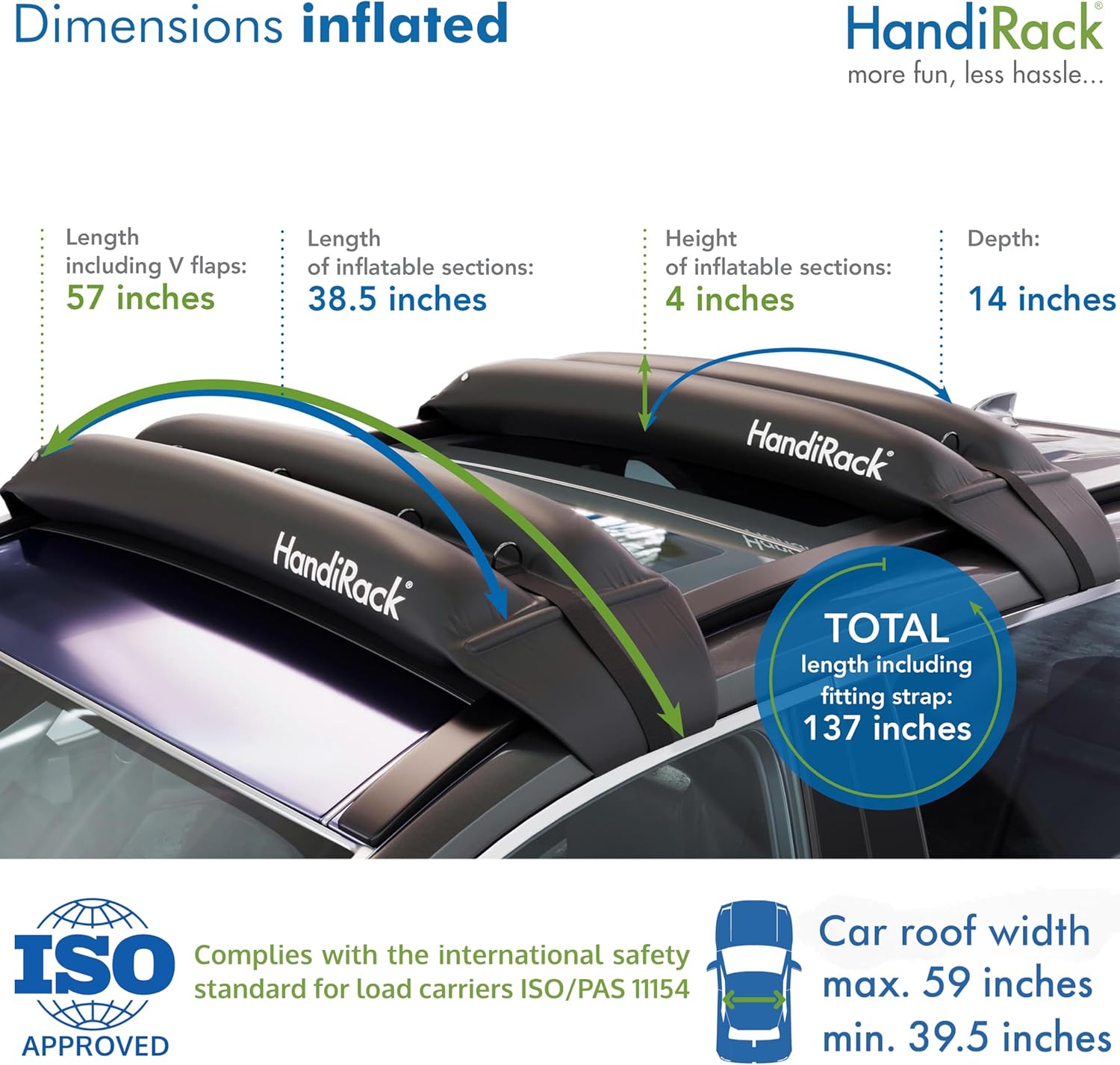 READY TO USE OUT OF THE BOX: Everything that you need is included; 2 x HandiRack twin tubes, 1 x HandiPump, 2 x 10ft tie-down straps, 2 x 11ft Bow and Stern Lines, drawstring storage bag and User Manual. Backed by a 1 year guarantee against manufacturing defect.