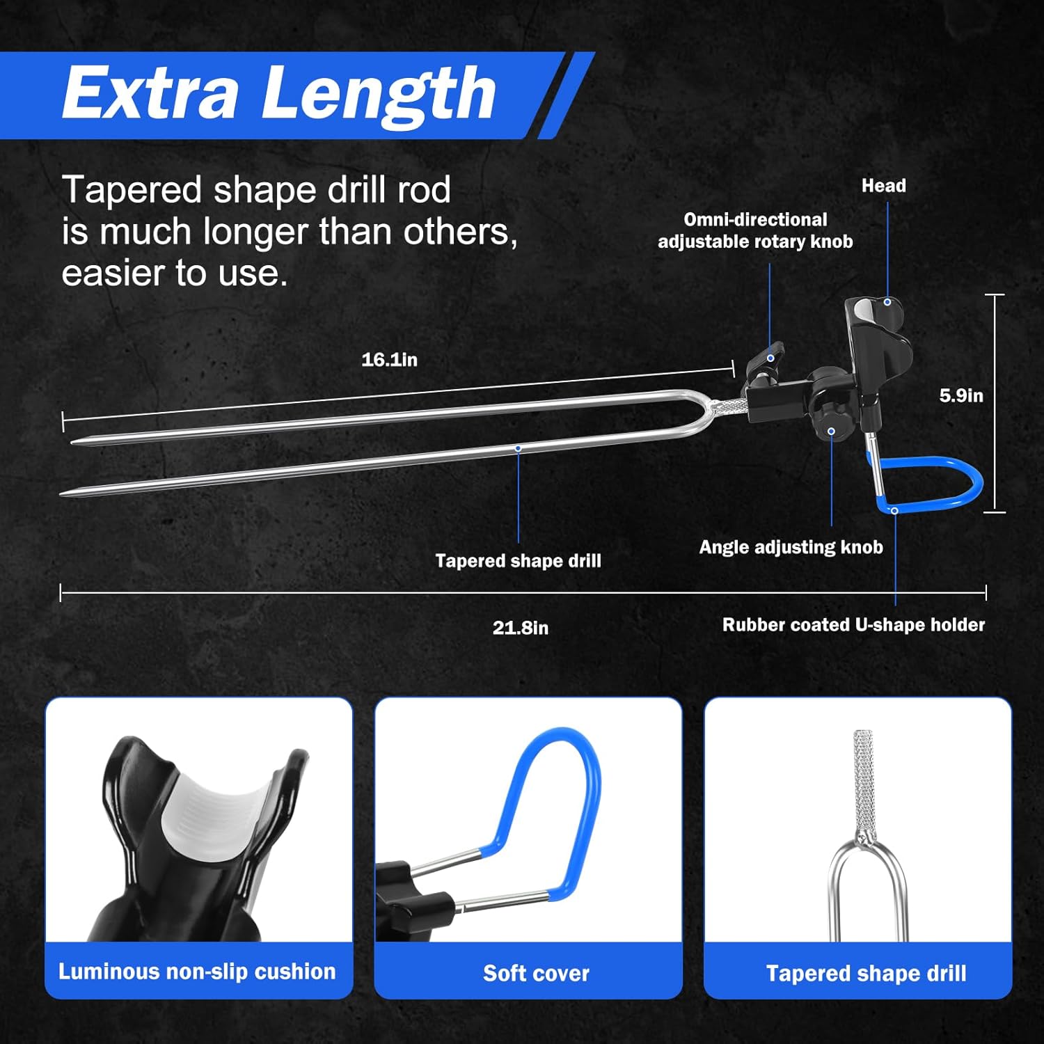 【PREMIUM MATERIAL】The upgraded fishing pole holders for ground is made of Reinforced Nylon, Smooth surface for easier cleaning. And the tapered shape drill rod is added with Rust-Proof Chrome Coating for rust prevention, extra lengthened, which can easily go into the ground(mud, sand, rock cracks).