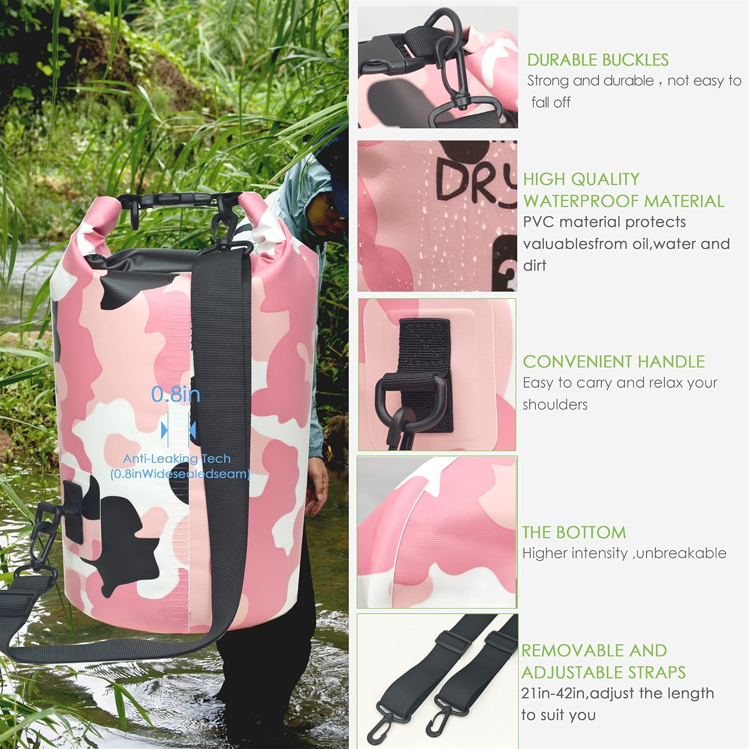 【ANTI LEAK AND ANTI TEAR】 The dry bag features fully welded seams by high-frequency tech, provides a stronger and more durably waterproof construction. Abrasion resistant for long lasting. It is a great choice as gift to outdoorsy women and men.