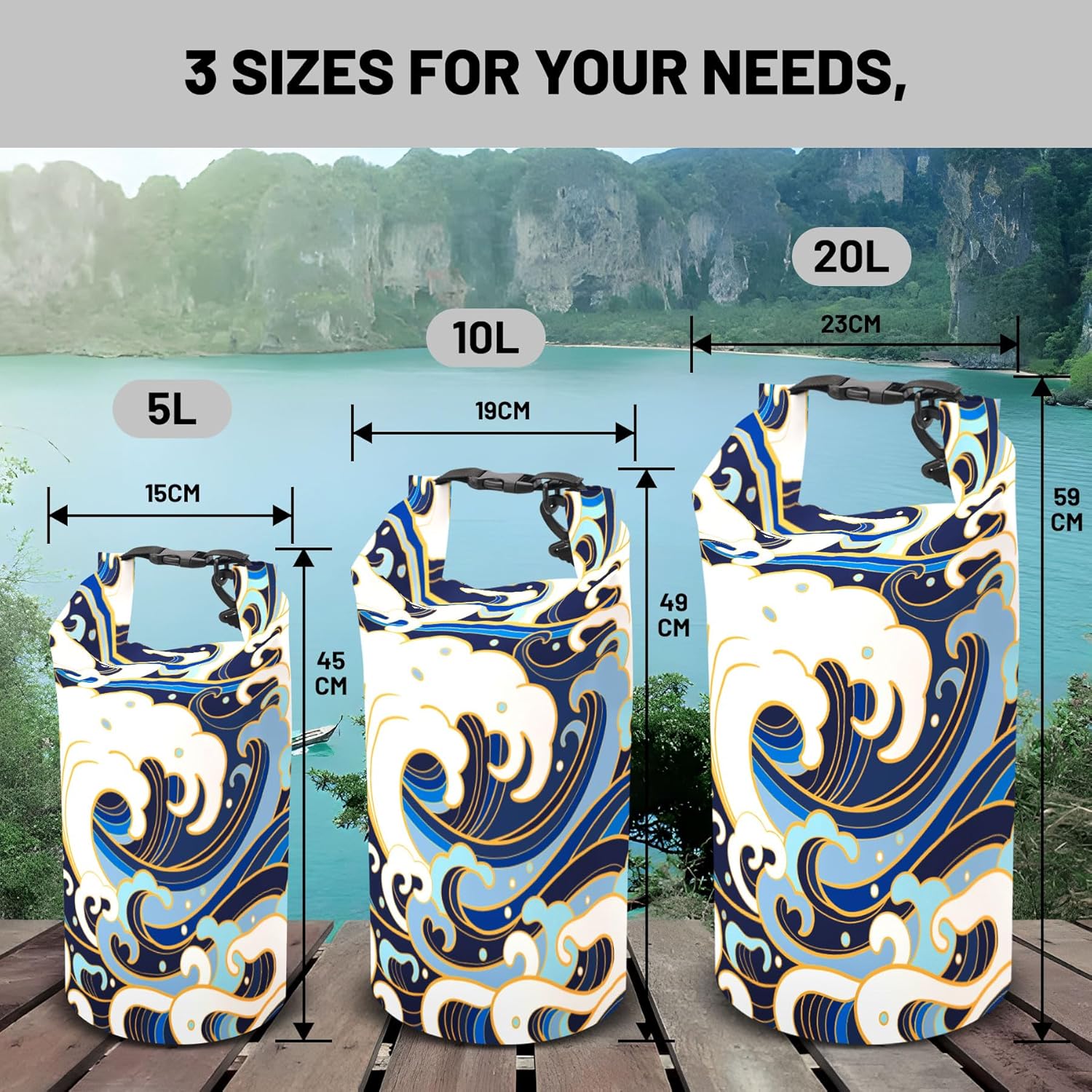Adjustable Carrying Options: Available in 5L and 10L with a removable shoulder strap for cross-body carry, or a 20L version featuring two adjustable straps for backpack-style comfort.Roll-top closure system provides secure watertight seal, keep your gear dry in any wet situation.Unique Japanese Blue and White Coastal design dry bag backpack Carry it your way!