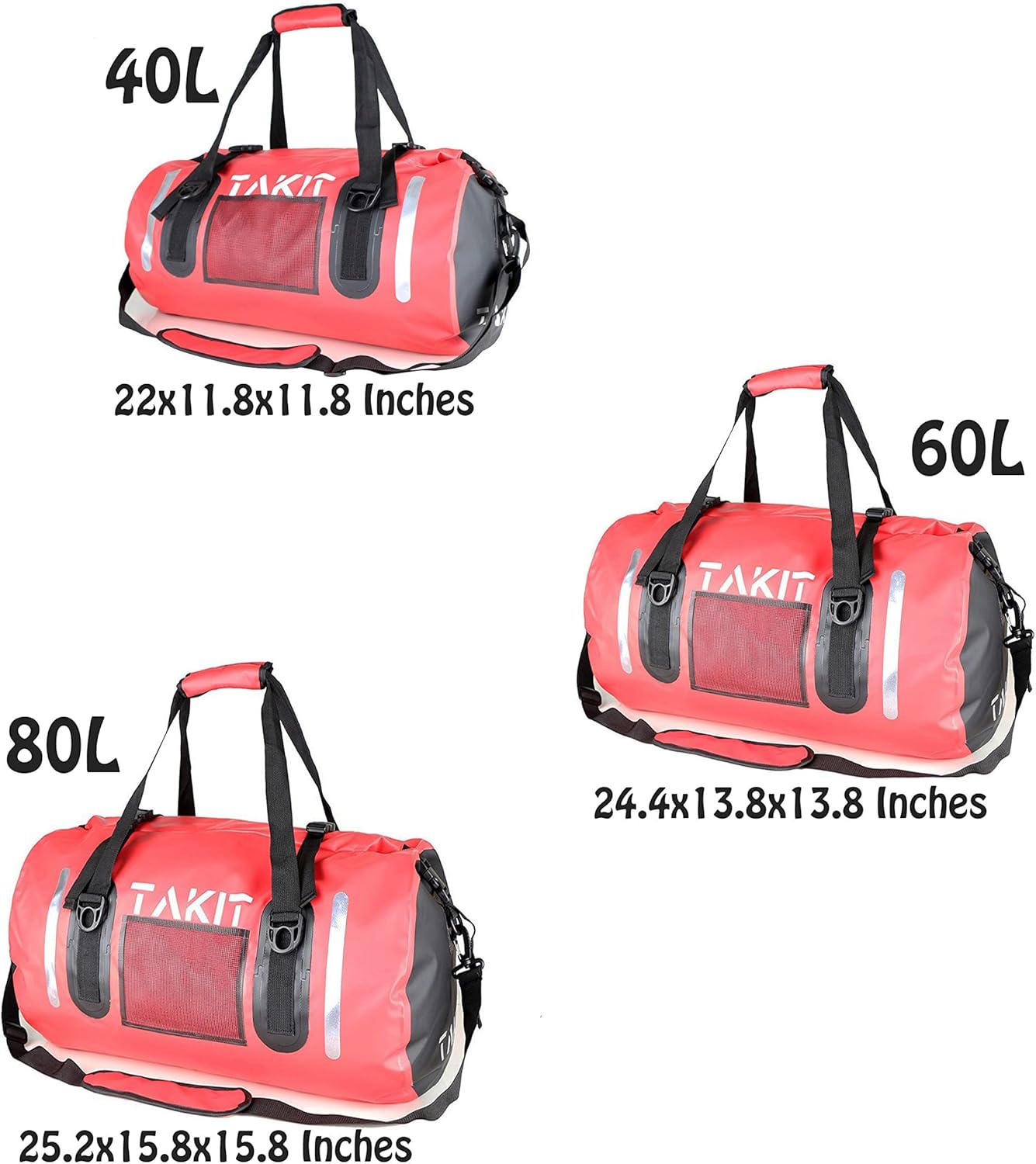 Explore the world and never worry about your gear getting wet again with the TAKIT Duffle bag. Every TAKIT Duffle bag is 100% waterproof to protect all your gear whatever the conditions – driving rain, sleet, snow, mud, or raging waters. Designed to hold up your gear, snacks, and electronics, we have 40 liter0 liter80 liter to let you choose, capacity backpacks and duffles are light, durable, and stylish. Whichever size you need, you’ll confidently carry all your gear for your next outdoor adventure. These dry bags will even float. Spend less time packing and unpacking and more time enjoying your next adventure!