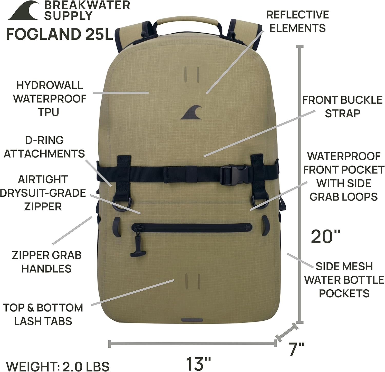 Waterproof Preparedness Pack, IP68 Submersible Airtight Backpack and Waterproof Marine First Aid Kit for Boating, Fishing, Kayaking (Fogland 25L Safari Tan Cordura)