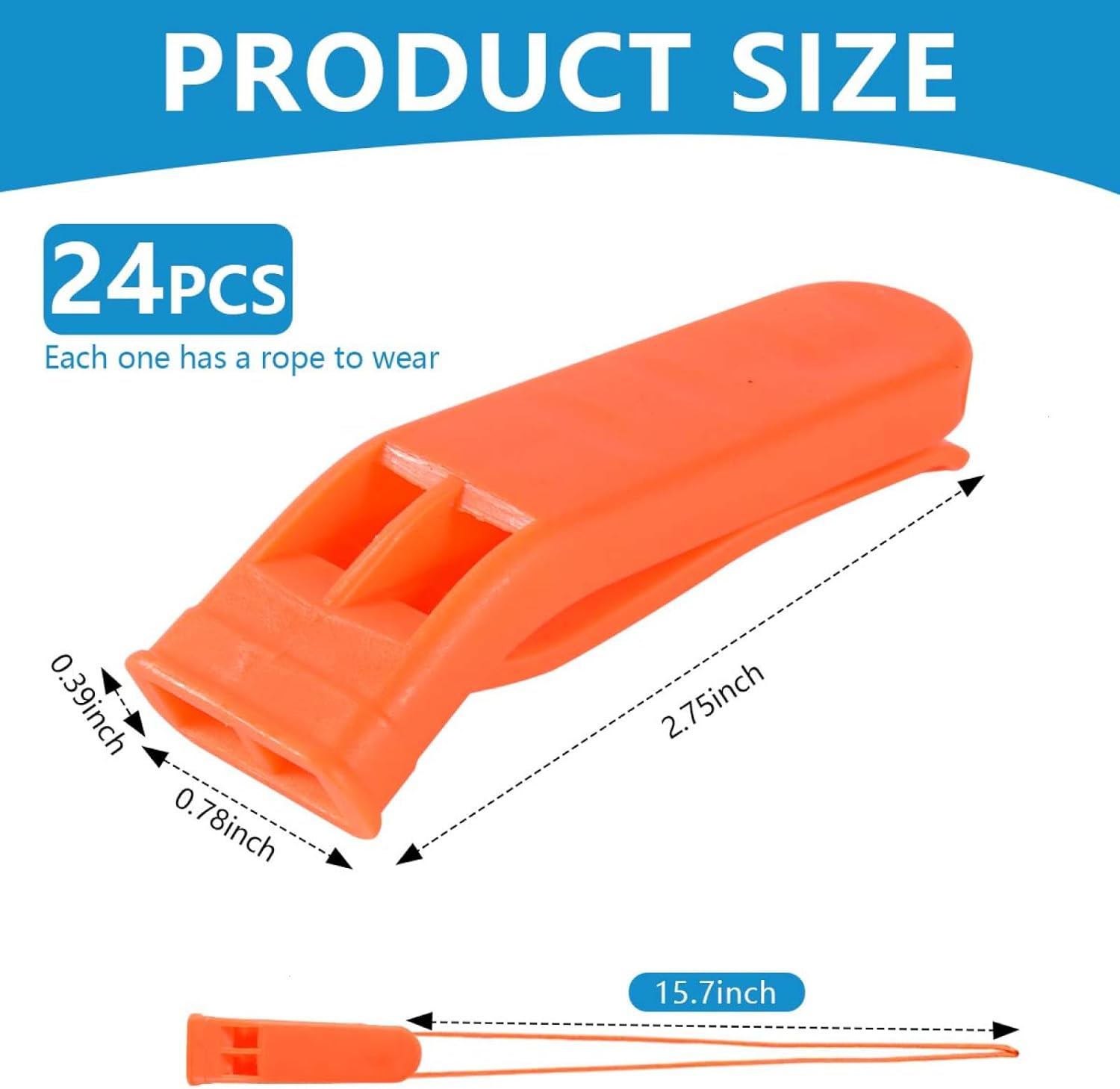 Package: After purchase, you will get 12 pcs orange safety whistles with lanyard, about 2.37” x 0.8” x 0.4”. There are enough quantities that can be used by yourself or shared with your team for use