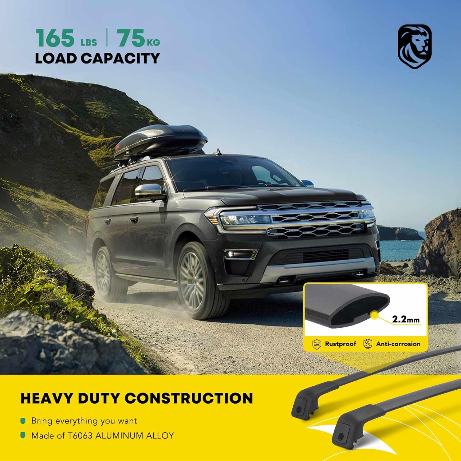 Eminently Durable: Our premium T6063 aluminum roof rack bars come with TS16949/ISO9001 grade authoritative quality certification and the material has advanced anti-rust features. High-strength but lightweight roof bars have 165 lbs load capacity